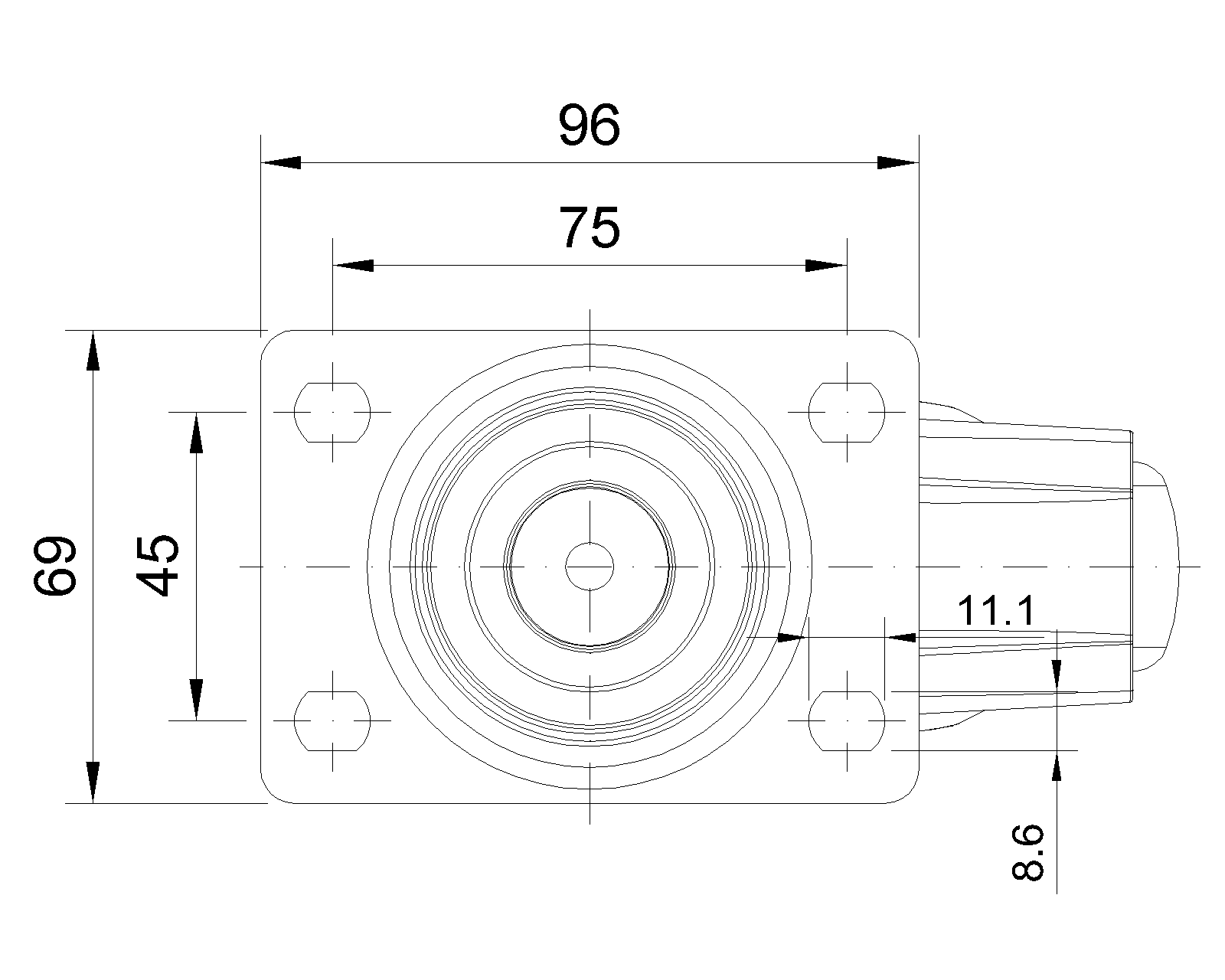 固定式脚轮,高级底板—75x45斜孔底板 黑色脚架采用聚醯胺增强料,丝扣式安装 防銹,耐腐蚀,美观,经济,转动灵活 耐冲击聚丙烯轮芯,热塑性弹性体(TPR)轮面 黑黑色,轮子轴承—精密滚珠 |