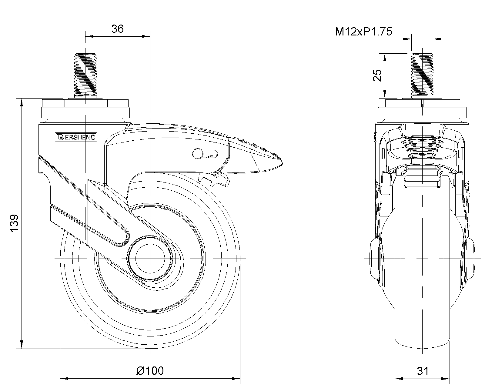 双煞式锁定系统的脚轮,丝扣M12x25 蓝灰脚架采用聚醯胺增强料,丝扣式安装 防銹,耐腐蚀,美观,经济,转动灵活 耐冲击聚丙烯轮芯,热塑性弹性体(TPR)轮面 深灰色,轮子轴承—精密滚珠 |