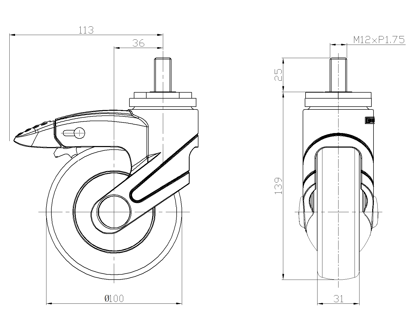 Polyamide Fork—M12x25 thread, zinc-plated finish, Mounting Type - Threaded Stem. High-Quality Impact-Resistant Polypropylene Wheel Center with High-Quality Reinforced Polypropylene Rubber (TPR) Wheel Tread. Dark gray, Bearing—Ball Bearings. |