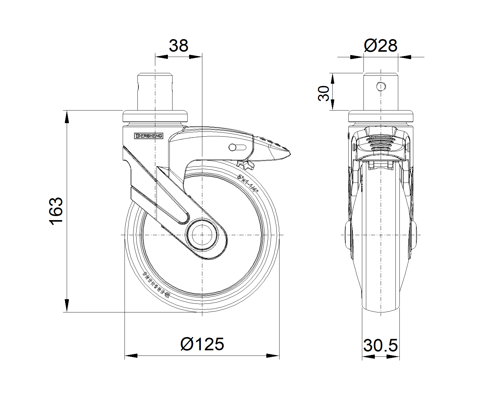 Casters with a long double-With locking system, rivet-type—Ø28x30L Pearl-finish Casters with polyamide reinforcement, insert-type Mounting Type Rust-proof, Corrosion resistant, Attractive appearance, Economical, and Smooth rotation High-Quality Impact-Resistant Polypropylene Wheel Center, High-Quality Reinforced Polypropylene Rubber (TPR) Wheel Tread Dark gray, center-tube type wheels |
