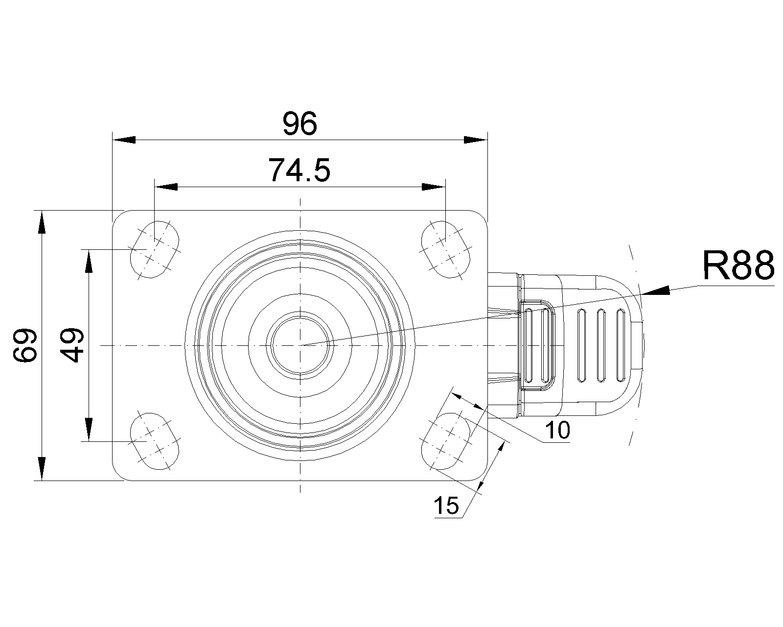 长双煞式锁定系统的脚轮,74.5x49斜孔底板 蓝灰脚架采用聚醯胺增强料,底板式安装 防銹,耐腐蚀,美观,经济,转动灵活 耐冲击聚丙烯轮芯,热塑性弹性體(TPR)轮面 深灰色,轮子轴承—精密滚珠 |