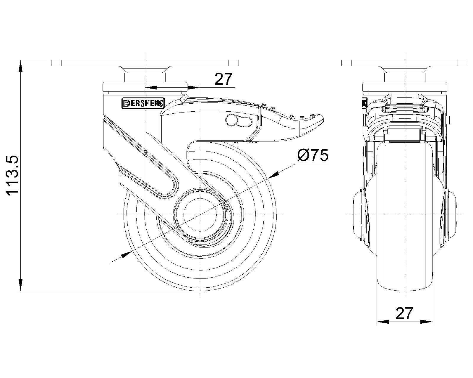 长双煞式锁定系统的脚轮,75x45高级底板 蓝灰脚架采用聚醯胺增强料,底板式安装 防銹,耐腐蚀,美观,经济,转动灵活 耐冲击聚丙烯轮芯,热塑性弹性體(TPR)轮面 深灰色,轮子轴承—精密滚珠 |