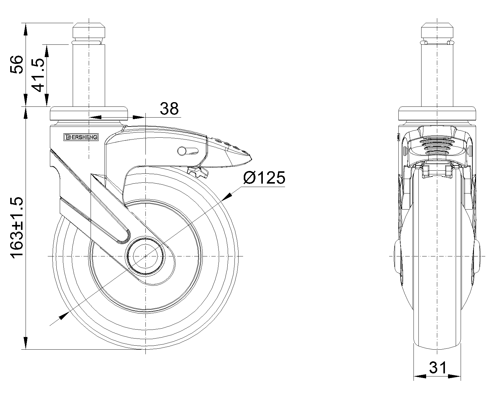 长双煞式锁定系统的脚轮,插心铆钉—Ø21.6x56L 蓝灰脚架采用聚醯胺增强料,插杆式安装 防銹,耐腐蚀,美观,经济,转动灵活 耐冲击聚丙烯轮芯,热塑性弹性體(TPR)轮面 深灰色,轮子—中管式 |