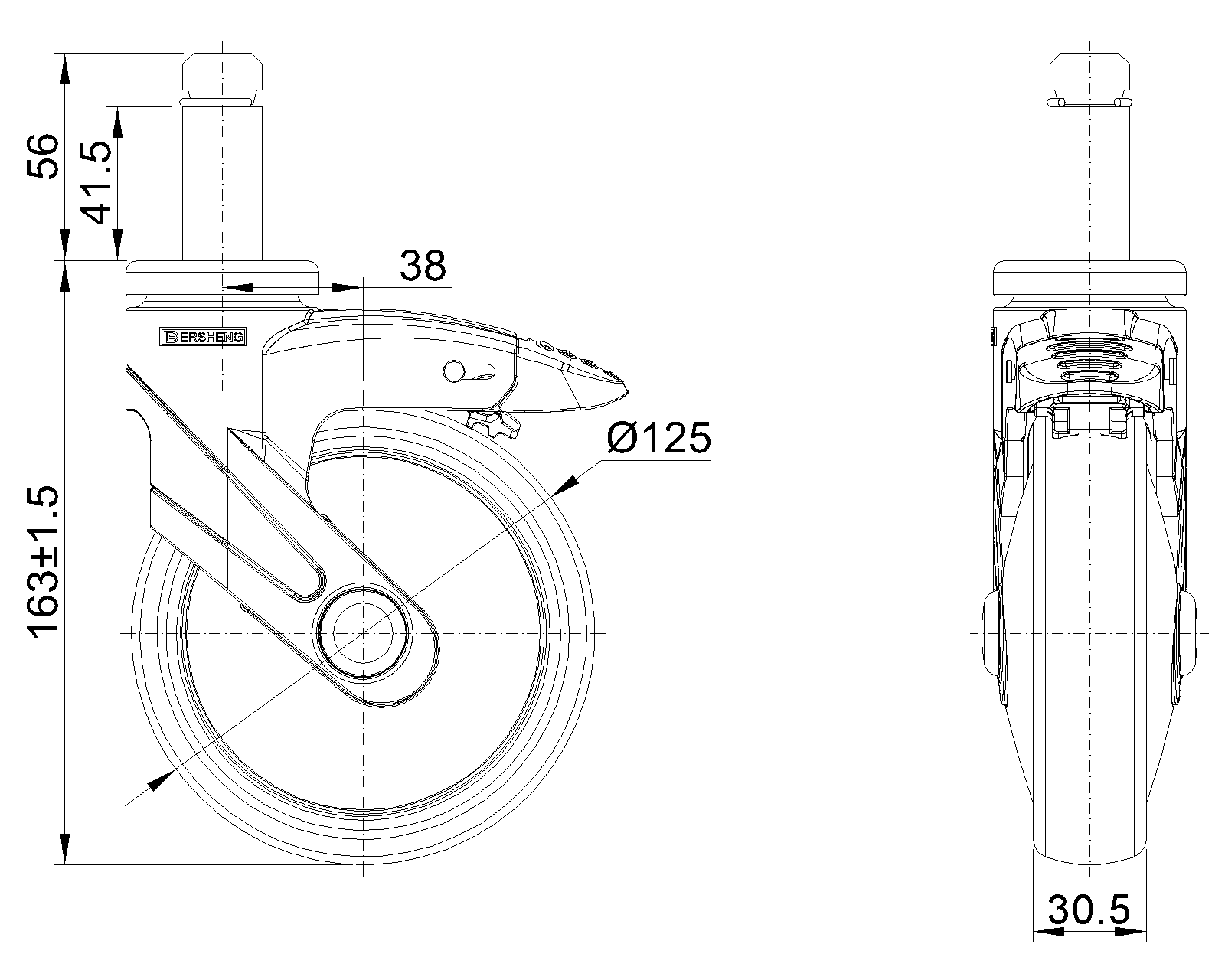 长双煞式锁定系统的脚轮,插心铆钉—Ø21.6x56L 珠光脚架采用聚醯胺增强料,插杆式安装 防銹,耐腐蚀,美观,经济,转动灵活 耐冲击聚丙烯轮芯,热塑性弹性體(TPR)轮面 深灰色,轮子—中管式 |