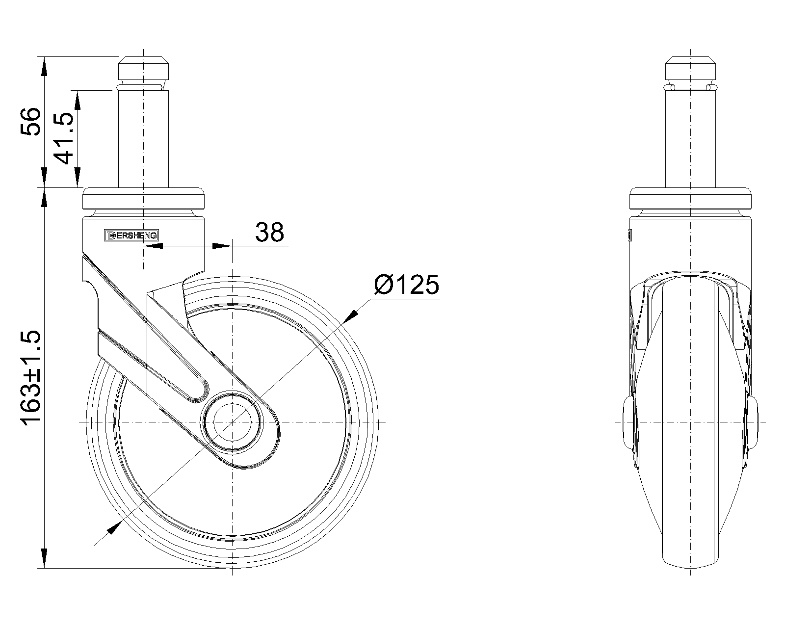 活动式脚轮,插心铆钉—Ø21.6x56L 蓝灰脚架采用聚醯胺增强料,插杆式安装 防銹,耐腐蚀,美观,经济,转动灵活 耐冲击聚丙烯轮芯,热塑性弹性體(TPR)轮面 深灰色,轮子—中管式 |