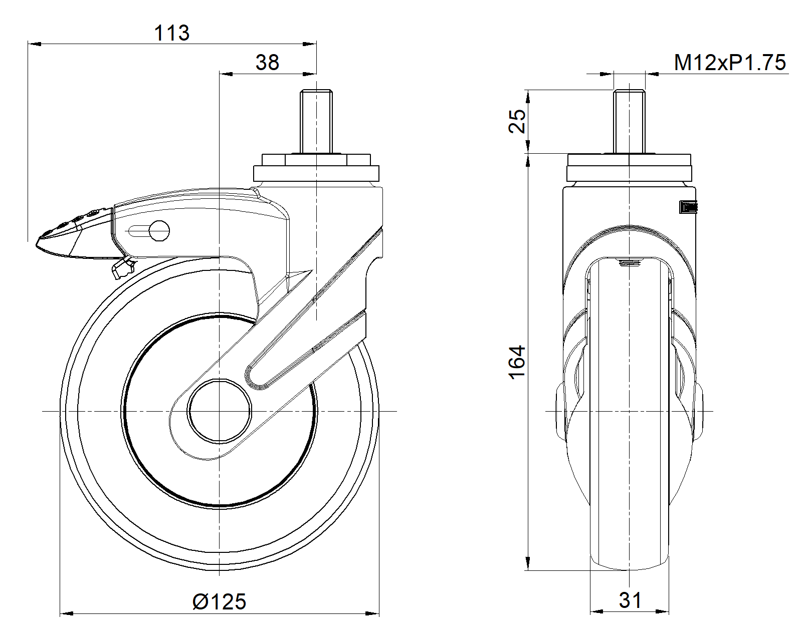 Hệ thống bánh xe khóa kép, ren M12x25 Chân màu xanh xám làm bằng vật liệu polyamide gia cố, lắp ren Chống gỉ, chống ăn mòn, thẩm mỹ, tiết kiệm và cho phép quay trơn tru Lõi bánh xe bằng polypropylene chống va đập, bề mặt bánh xe bằng nhựa nhiệt dẻo đàn hồi (TPR) Vòng bi bánh xe màu xám đậm—vòng bi chính xác |