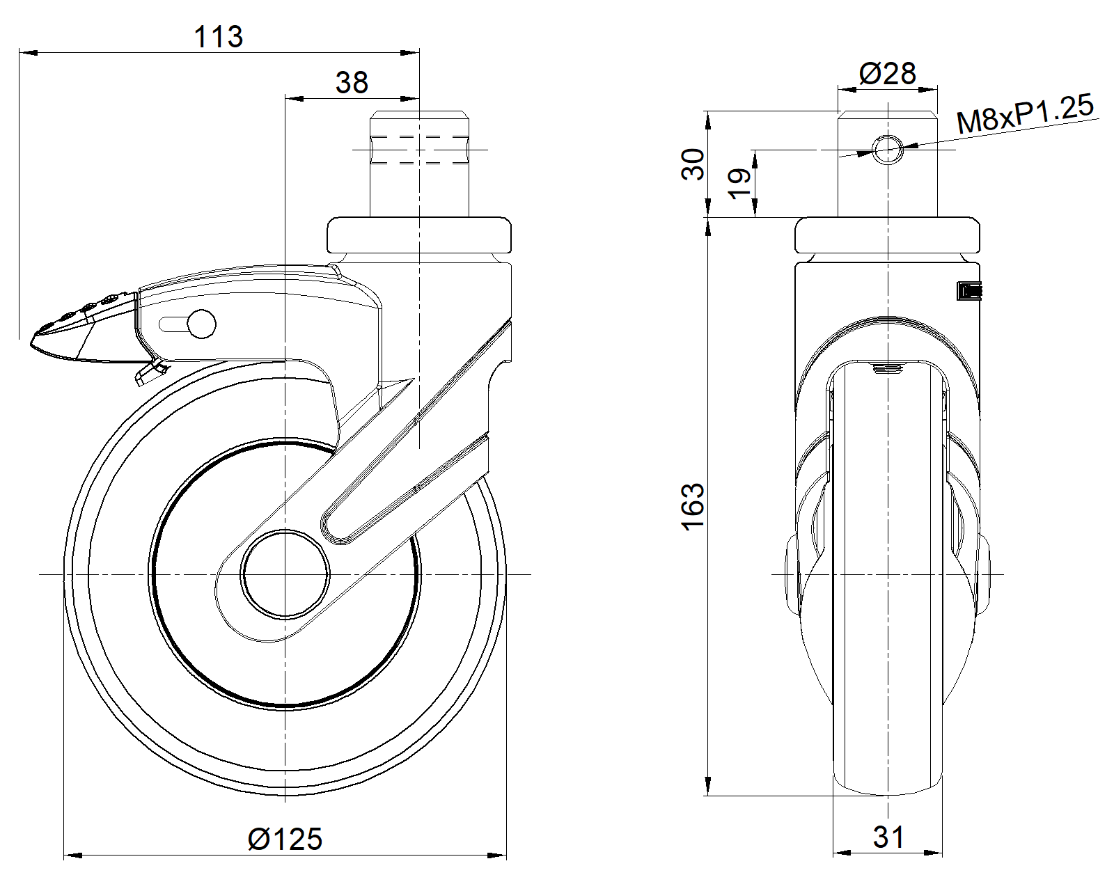 Bánh xe có hệ thống khóa phanh định hướng, thanh chèn—Ø28x30L Chân polyamide màu xanh xám, mạ kẽm, lắp chèn Lõi bánh xe bằng polypropylene chống va đập, bề mặt bánh xe bằng nhựa nhiệt dẻo đàn hồi (TPR) Vòng bi bánh xe màu xám đậm—vòng bi chính xác |
