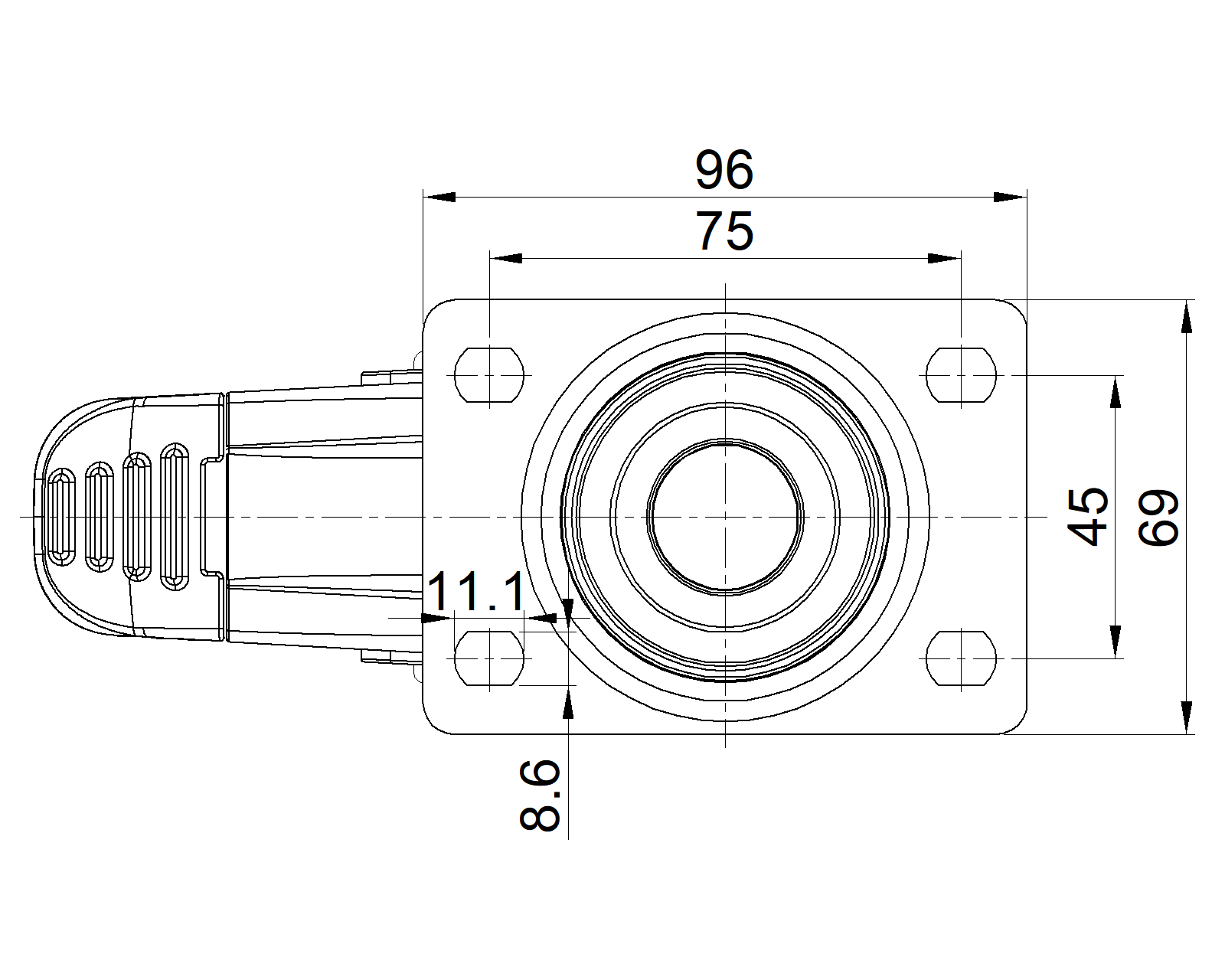 Bánh xe xoay trung tâm khóa phanh định hướng, đế cao cấp 75 x 45 Chân polyamide màu xanh xám, lắp đế Lõi bánh xe bằng polypropylen chống va đập, bề mặt bánh xe bằng nhựa nhiệt dẻo đàn hồi (TPR) Vòng bi bánh xe màu xám đậm—vòng bi chính xác |