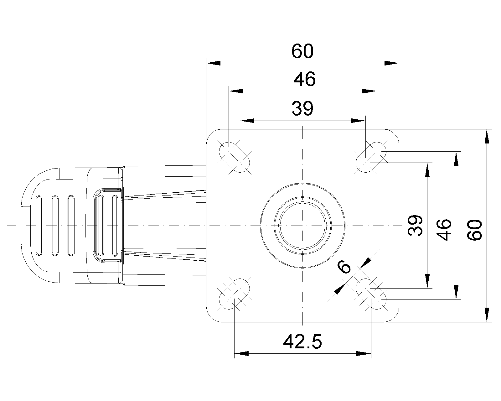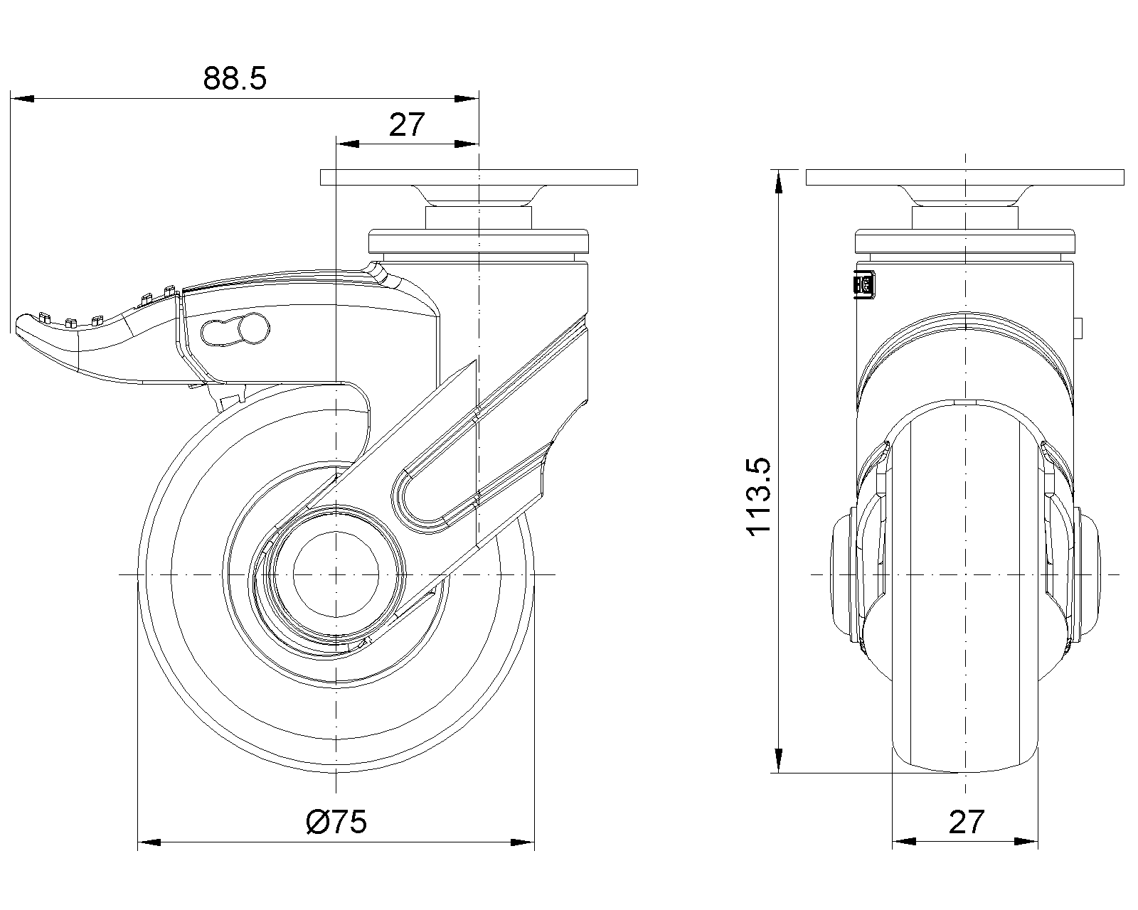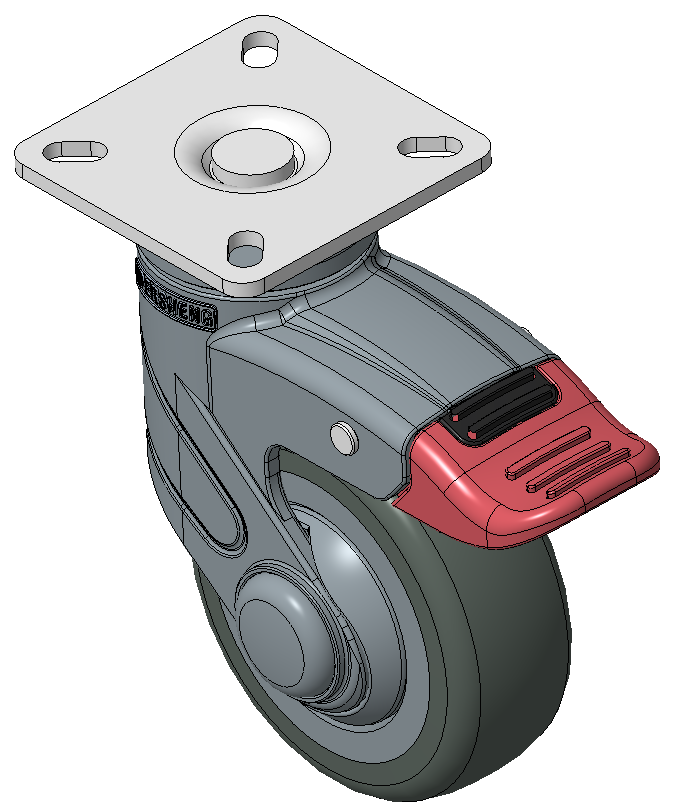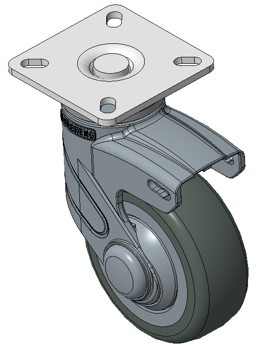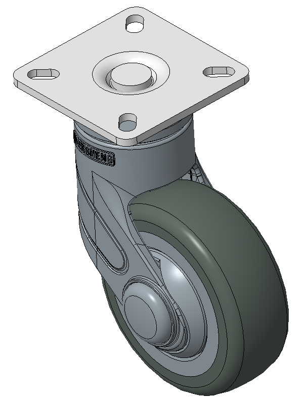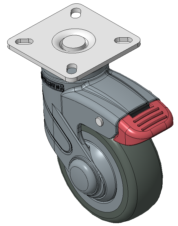 Bánh xe với hệ thống khóa phanh kép dài, đế lỗ góc 42,5x42,5mm Chân polyamide màu xanh xám, lắp đế Lõi bánh xe bằng polypropylene chống va đập, bề mặt bánh xe bằng nhựa nhiệt dẻo đàn hồi (TPR) Vòng bi bánh xe màu xám đậm—vòng bi chính xác |