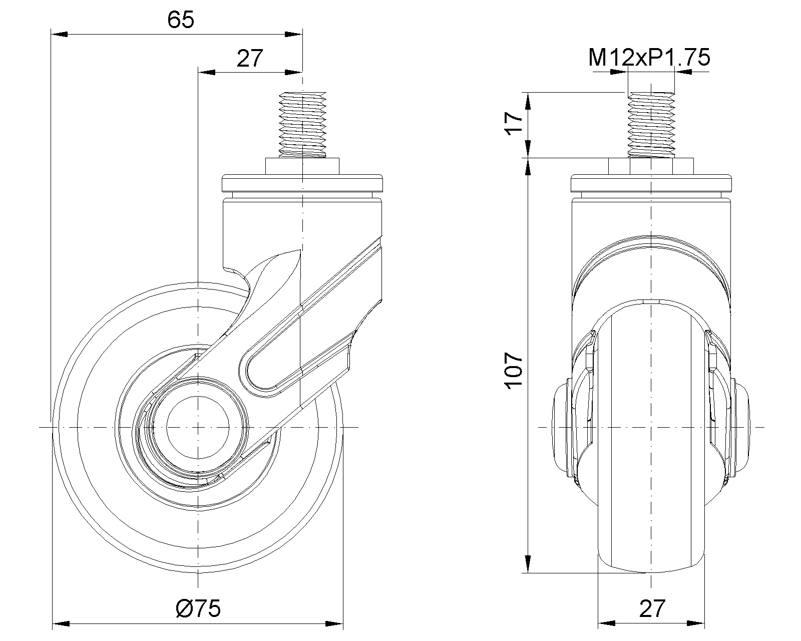 Bánh xe xoay, lắp ren—M12x17 Chân polyamide màu xanh xám, lắp ren Lõi bánh xe bằng polypropylene chống va đập, bề mặt bánh xe bằng nhựa nhiệt dẻo đàn hồi (TPR) Vòng bi bánh xe màu xám đậm—vòng bi chính xác |