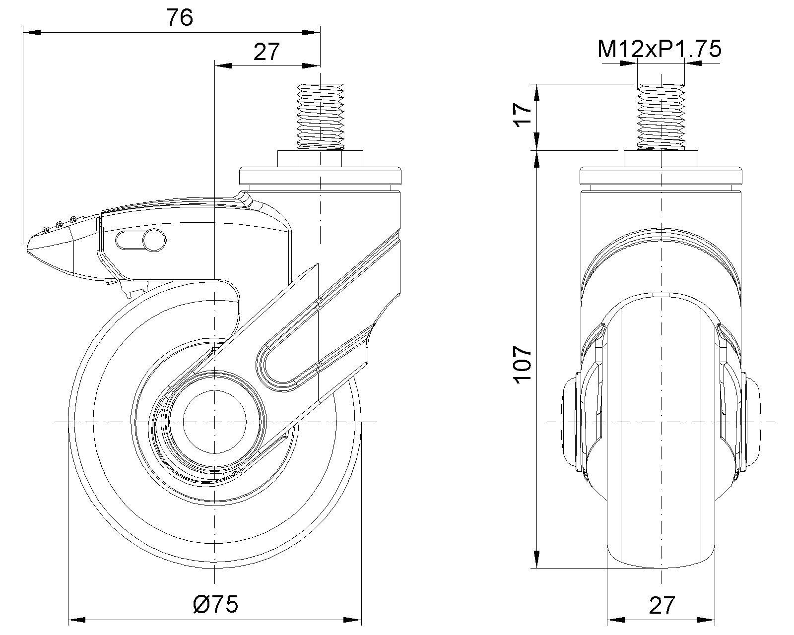 Bánh xe hệ thống khóa phanh kép ngắn, ren M12x17 Chân màu xanh xám làm bằng polyamide gia cố, lắp ren Chống gỉ, chống ăn mòn, thẩm mỹ, tiết kiệm và xoay linh hoạt Lõi bánh xe bằng polypropylene chống va đập, bề mặt bánh xe bằng nhựa nhiệt dẻo đàn hồi (TPR) Vòng bi bánh xe màu xám đậm—vòng bi chính xác |