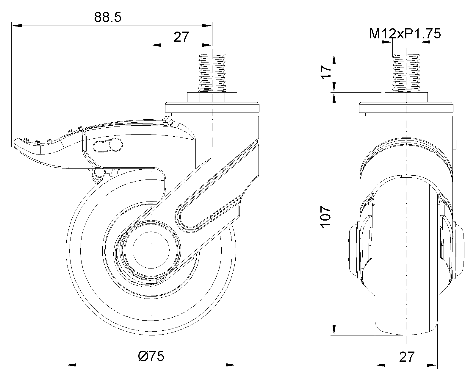 Bánh xe với hệ thống khóa kép dài, ren—M12x17 Chân polyamide màu xanh xám, lắp ren Lõi bánh xe bằng polypropylene chống va đập, bề mặt bánh xe bằng nhựa nhiệt dẻo đàn hồi (TPR) Vòng bi bánh xe màu xám đậm—vòng bi chính xác |