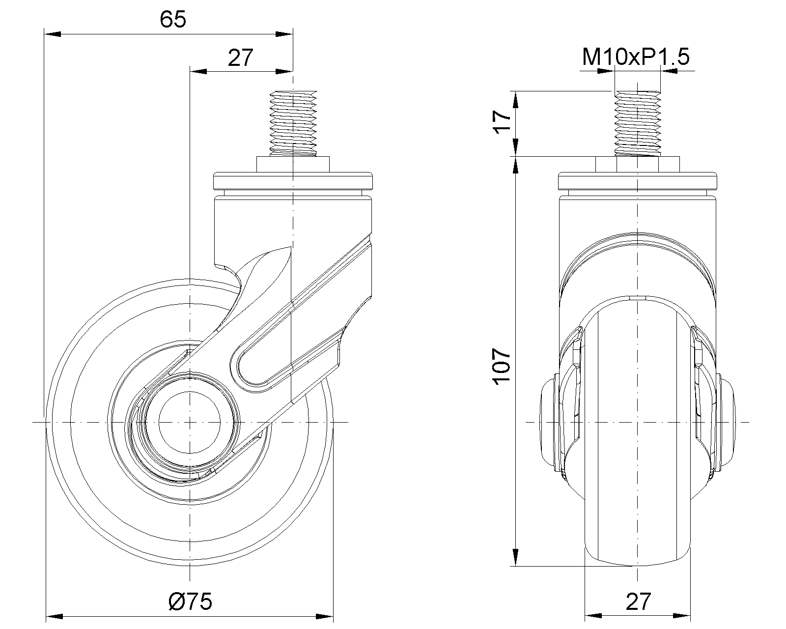 Bánh xe xoay, ren—M10x17 Chân polyamide màu xanh xám, lắp ren Lõi bánh xe bằng polypropylene chống va đập, bề mặt bánh xe bằng nhựa nhiệt dẻo đàn hồi (TPR) Vòng bi bánh xe màu xám đậm—vòng bi chính xác |