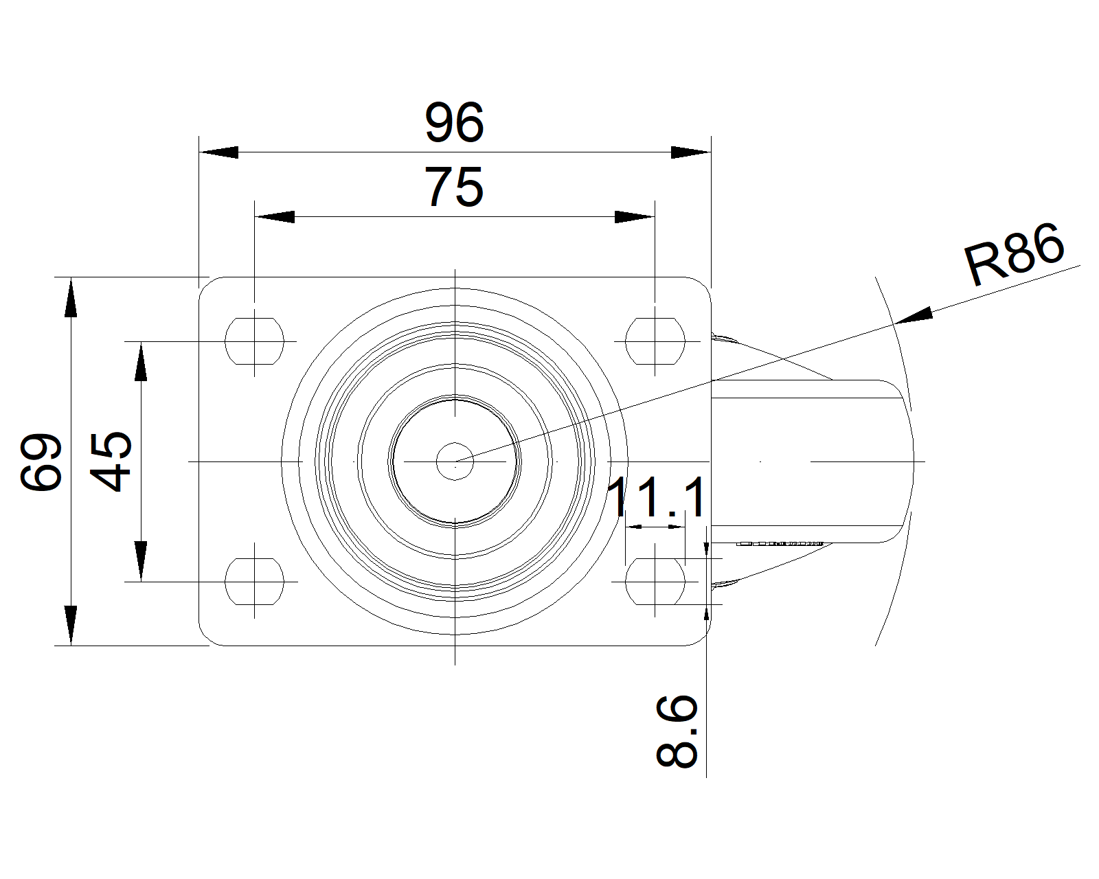 Quy cách tấm lắp 96 x 69mm khoảng cách các lỗ trên tấm nền 75 x 45mm Khoảng cách các lỗ lắp 11.1 x 8.6mm Độ lệch tâm 36mm Sự can thiệp quay 172mm Tổng chiều cao 141.5mm Bán kính xoay 86mm Độ cứng 72±5° Shore A Tải trọng (động) 90kgs |