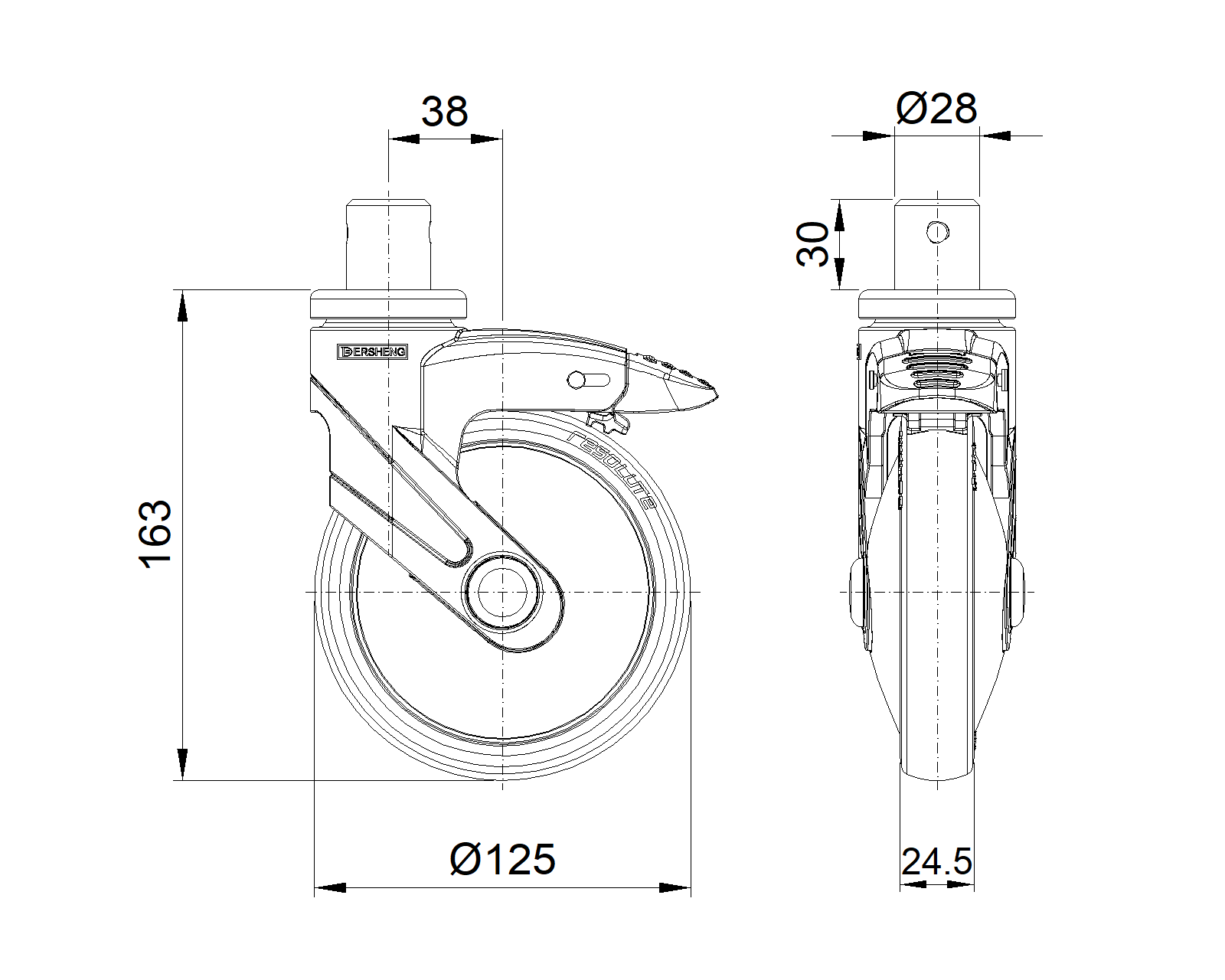 Bánh xe với hệ thống khóa phanh kép dài, kiểu đinh tán—Ø28x30L Chân màu xanh xám làm bằng vật liệu polyamide gia cố, lắp chốt. Chống gỉ, chống ăn mòn, thẩm mỹ, tiết kiệm và xoay linh hoạt. Lõi bánh xe bằng polypropylene chống va đập, bề mặt bánh xe bằng nhựa nhiệt dẻo đàn hồi (TPR). Vòng bi bánh xe màu xám đậm—vòng bi chính xác. |