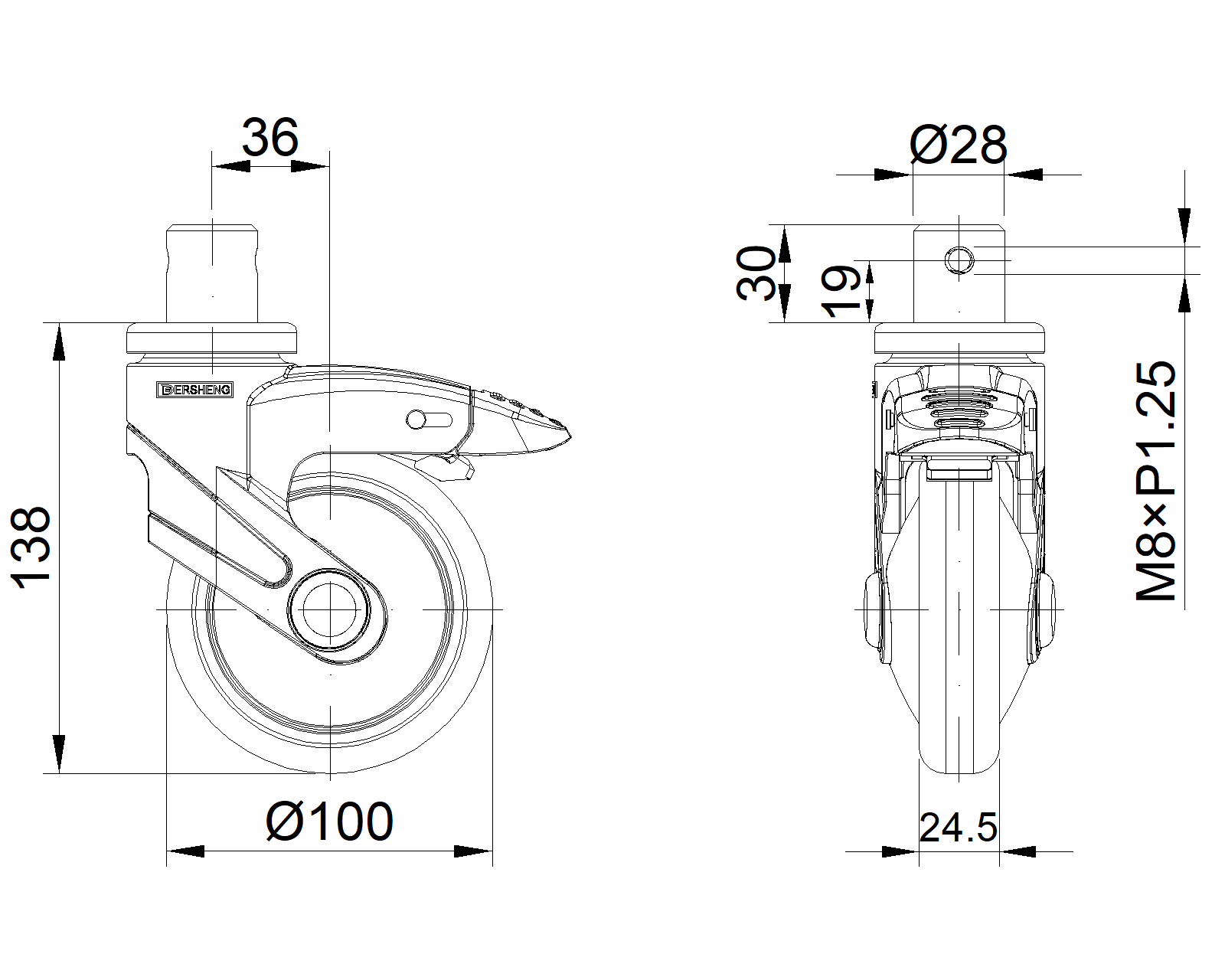 Bánh xe có hệ thống khóa phanh kép, đinh tán chốt—Ø28x30L Đế bánh xe bằng nhựa gia cường polyamide, lắp đặt bằng chốt Chống gỉ sét, chống ăn mòn, thẩm mỹ, tiết kiệm và xoay êm ái Lõi bánh xe bằng polypropylen chống va đập, bề mặt bánh xe bằng nhựa nhiệt dẻo đàn hồi (TPR) Vòng bi bánh xe màu xám đậm—vòng bi chính xác |