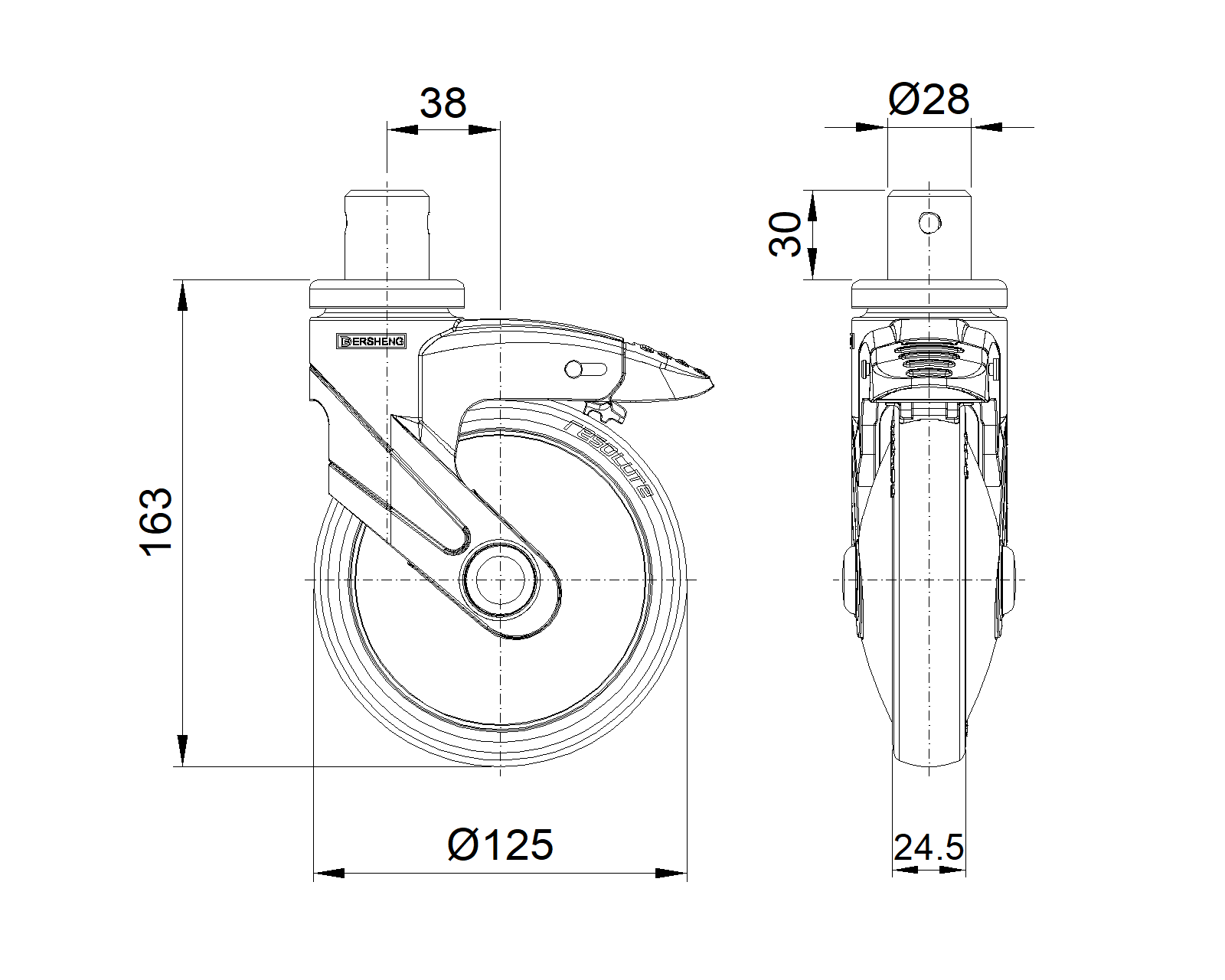 Bánh xe dài, phanh đôi, hệ thống khóa, đinh tán chốt—Ø28x30L Chân màu ngọc trai, gia cố bằng polyamide, lắp đặt khóa Chống gỉ, chống ăn mòn, đẹp, tiết kiệm và xoay linh hoạt Lõi bánh xe bằng polypropylen chống va đập, bề mặt bánh xe bằng nhựa nhiệt dẻo đàn hồi (TPR) Bánh xe màu xám đậm—loại ống giữa |