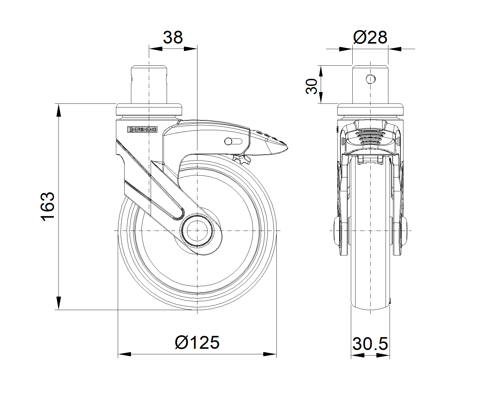Bánh xe dài, phanh đôi, hệ thống khóa, chốt đinh tán—Ø28x30L Chân màu xanh xám làm bằng vật liệu polyamide gia cố, lắp đặt bằng chốt Chống gỉ, chống ăn mòn, thẩm mỹ, tiết kiệm và xoay linh hoạt Lõi bánh xe bằng polypropylen chống va đập, bề mặt bánh xe bằng nhựa nhiệt dẻo đàn hồi (TPR) Bánh xe màu xám đậm—loại ống trung tâm |