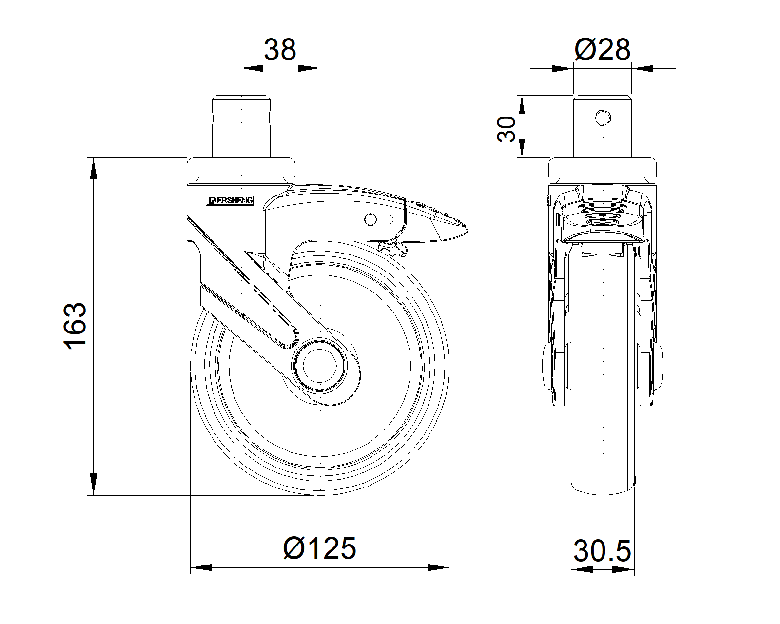 Bánh xe dài, phanh đôi, hệ thống khóa, chốt đinh tán—Ø28x30L Chân màu xanh xám làm bằng vật liệu polyamide gia cố, lắp đặt bằng chốt Chống gỉ, chống ăn mòn, thẩm mỹ, tiết kiệm và xoay linh hoạt Lõi bánh xe bằng polypropylen chống va đập, bề mặt bánh xe bằng nhựa nhiệt dẻo đàn hồi (TPR) Bánh xe màu xám đậm—loại ống trung tâm |