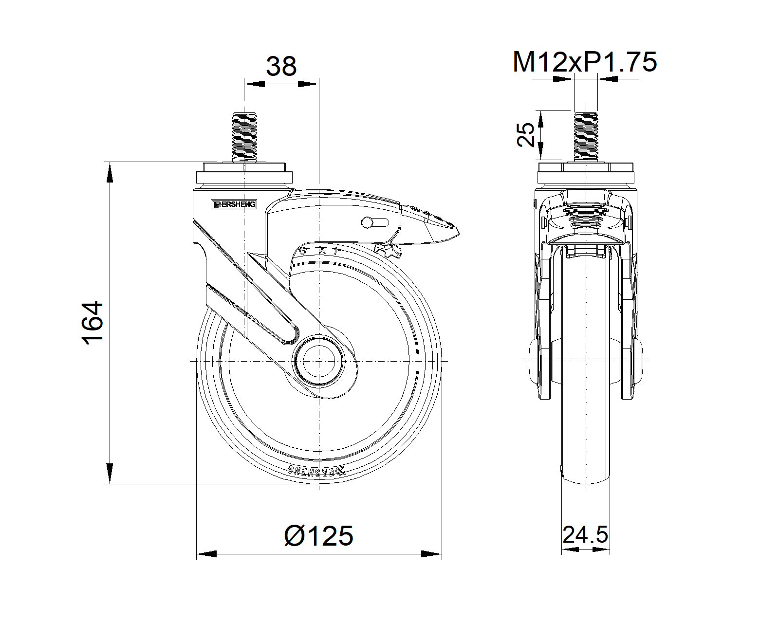 Bánh xe dài loại phanh kép, hệ thống khóa, ren M12x25 Chân màu xanh xám làm bằng polyamide gia cố, lắp ren Chống gỉ, chống ăn mòn, thẩm mỹ, tiết kiệm và xoay linh hoạt Lõi bánh xe bằng polypropylene chống va đập, bề mặt bánh xe bằng nhựa nhiệt dẻo đàn hồi (TPR) Bánh xe ống trung tâm màu xám đậm |
