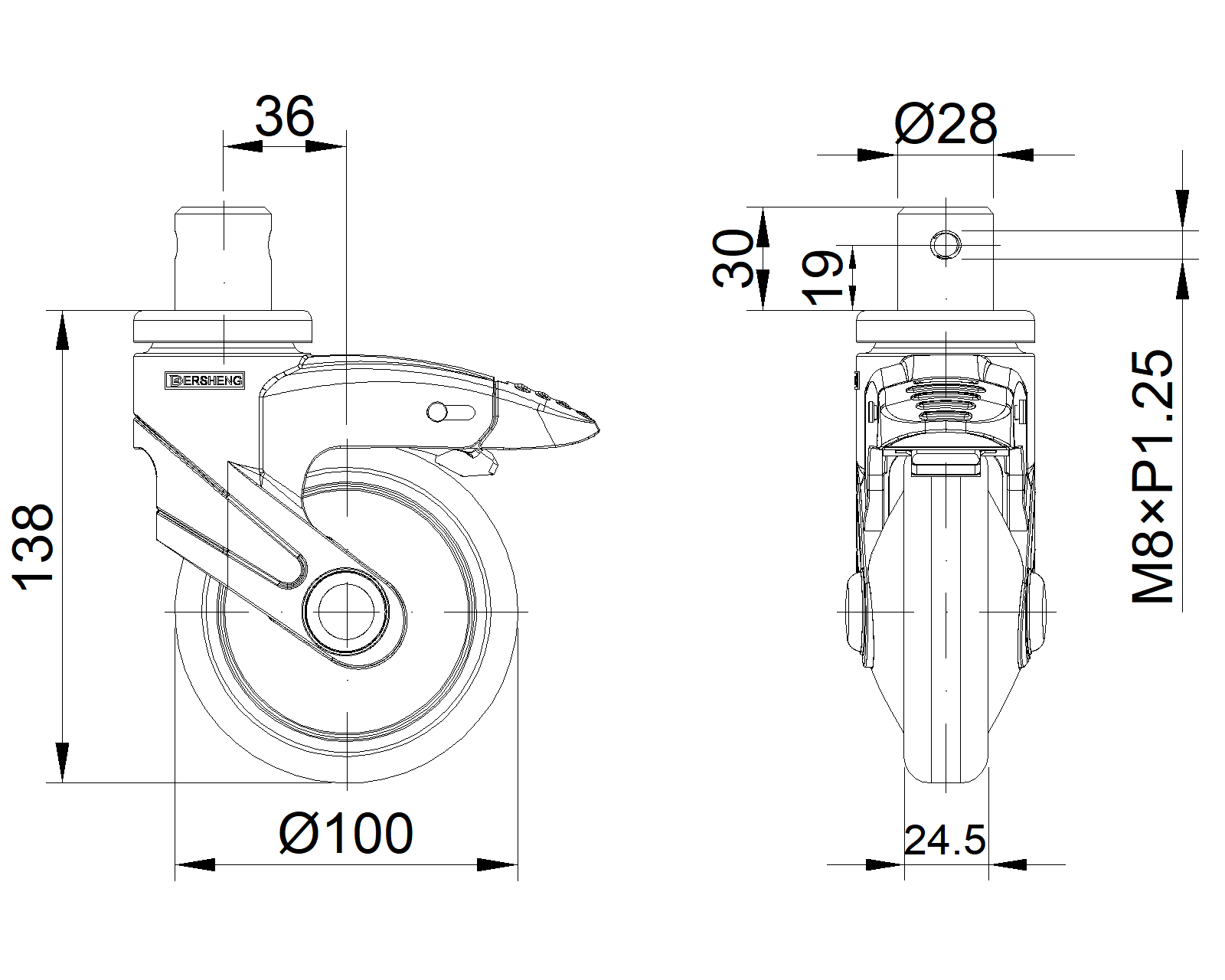 Bánh xe hệ thống khóa phanh kép, chốt đinh tán—Ø28x30L Bánh xe màu ngọc trai với lớp gia cố polyamide, lắp đặt bằng chốt Chống gỉ, chống ăn mòn, thẩm mỹ, tiết kiệm và xoay linh hoạt Lõi bánh xe bằng polypropylene chống va đập, bề mặt bánh xe bằng nhựa nhiệt dẻo đàn hồi (TPR) Bánh xe màu xám đậm—loại ống giữa |