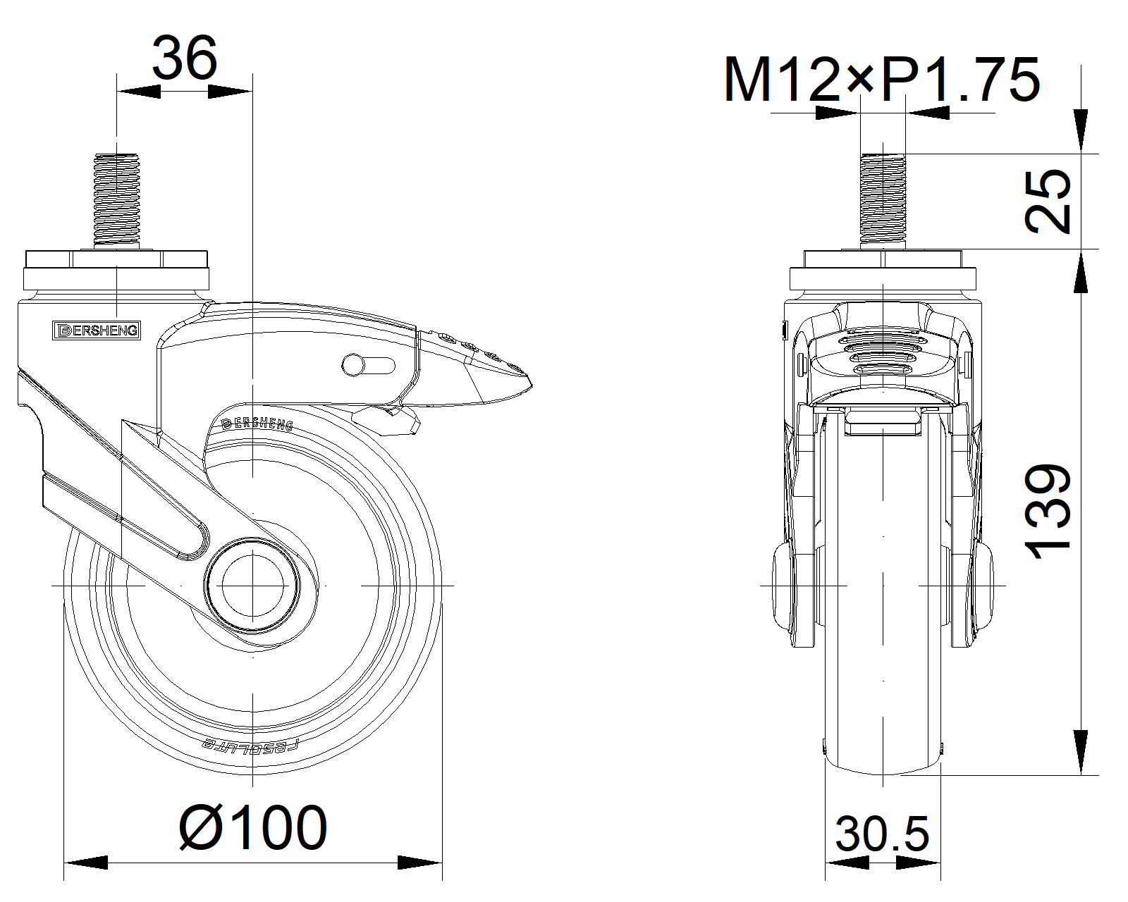 Hệ thống bánh xe khóa kép, ren M12x25 Chân màu xanh xám làm bằng polyamide gia cố, lắp ren Chống gỉ, chống ăn mòn, thẩm mỹ, tiết kiệm và xoay linh hoạt Lõi bánh xe bằng polypropylene chống va đập, bề mặt bánh xe bằng nhựa nhiệt dẻo đàn hồi (TPR) Bánh xe dạng ống trung tâm màu xám đậm |