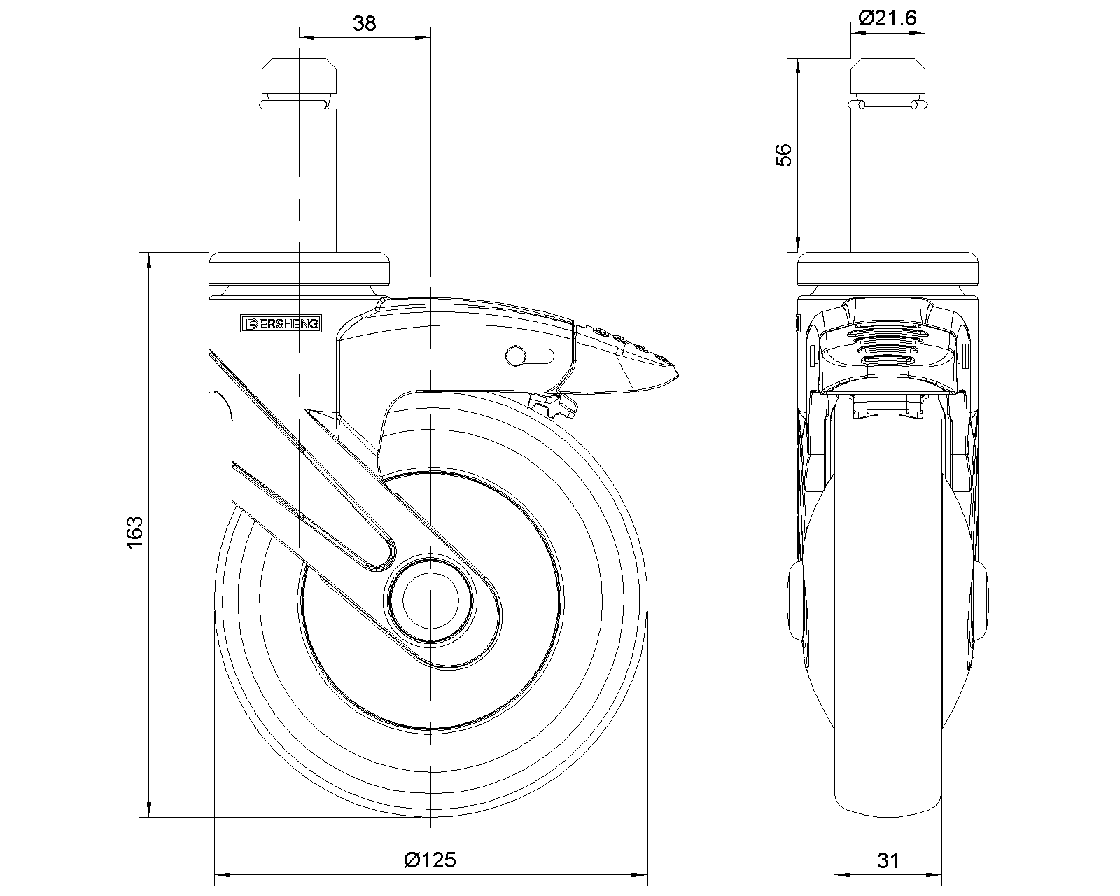 Bánh xe có hệ thống khóa phanh kép, Ø21.6x56L, có vòng đệm chữ C Chân màu xanh xám làm bằng vật liệu polyamide gia cố, lắp đặt bằng phích cắm Chống gỉ, chống ăn mòn, thẩm mỹ, tiết kiệm và xoay trơn tru Lõi bánh xe bằng polypropylen chống va đập, bề mặt bánh xe bằng nhựa nhiệt dẻo đàn hồi (TPR) Vòng bi bánh xe màu xám đậm—vòng bi chính xác |