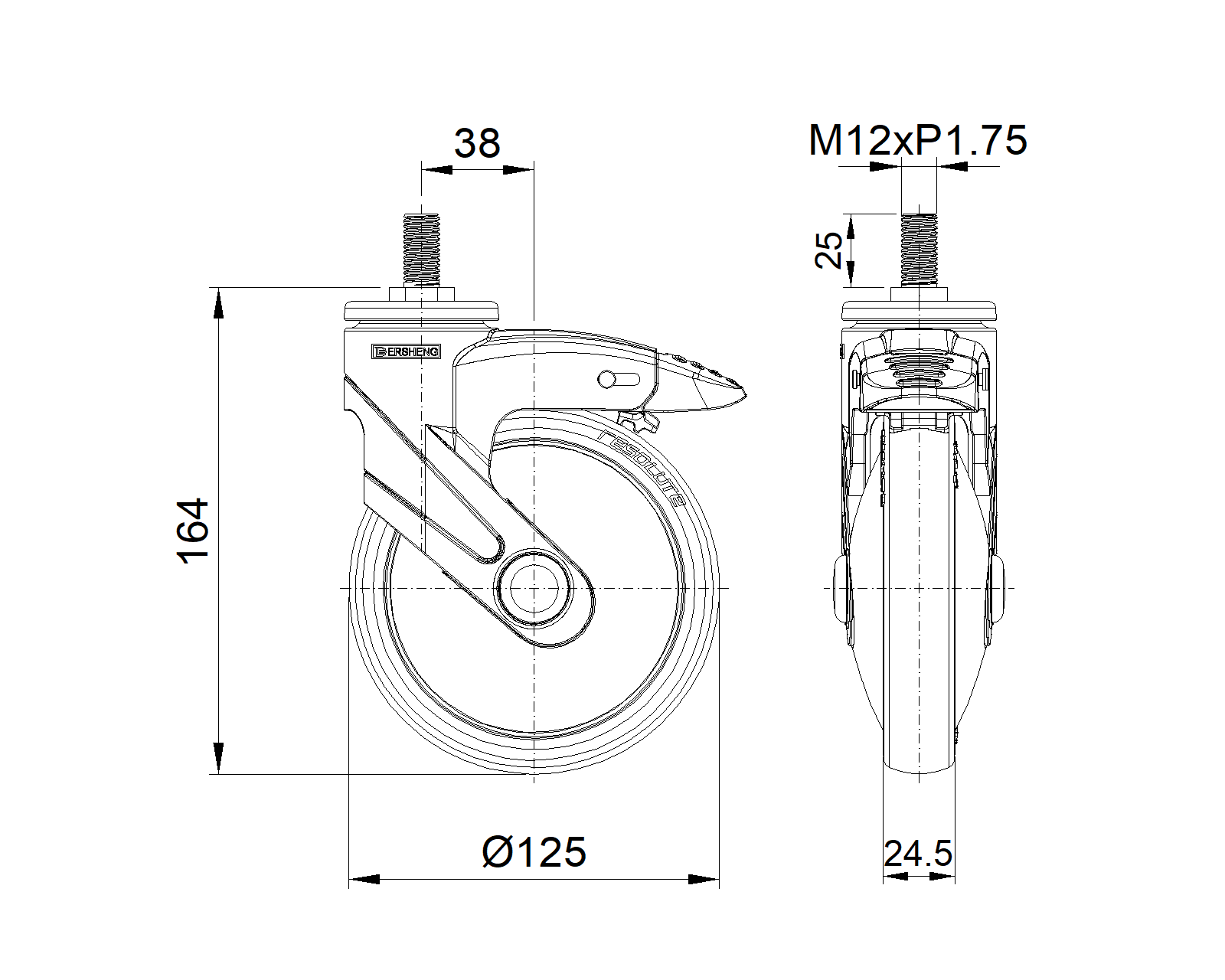 Bánh xe dài, phanh đôi, hệ thống khóa, ren M12x25 Chân màu ngọc trai, gia cố bằng polyamide, lắp ren Chống gỉ, chống ăn mòn, đẹp, tiết kiệm và xoay linh hoạt Lõi bánh xe bằng polypropylene chống va đập, bề mặt bánh xe bằng nhựa nhiệt dẻo đàn hồi (TPR) Bánh xe màu xám đậm, kiểu ống tâm |