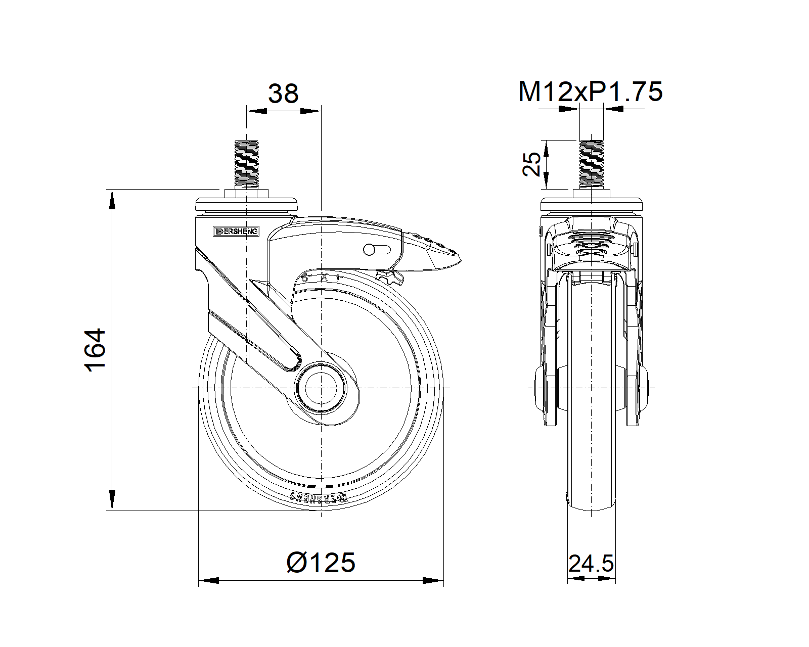 Bánh xe dài loại phanh kép, hệ thống khóa, ren M12x25 Chân màu xanh xám làm bằng polyamide gia cố, lắp ren Chống gỉ, chống ăn mòn, thẩm mỹ, tiết kiệm và xoay linh hoạt Lõi bánh xe bằng polypropylene chống va đập, bề mặt bánh xe bằng nhựa nhiệt dẻo đàn hồi (TPR) Bánh xe ống trung tâm màu xám đậm |