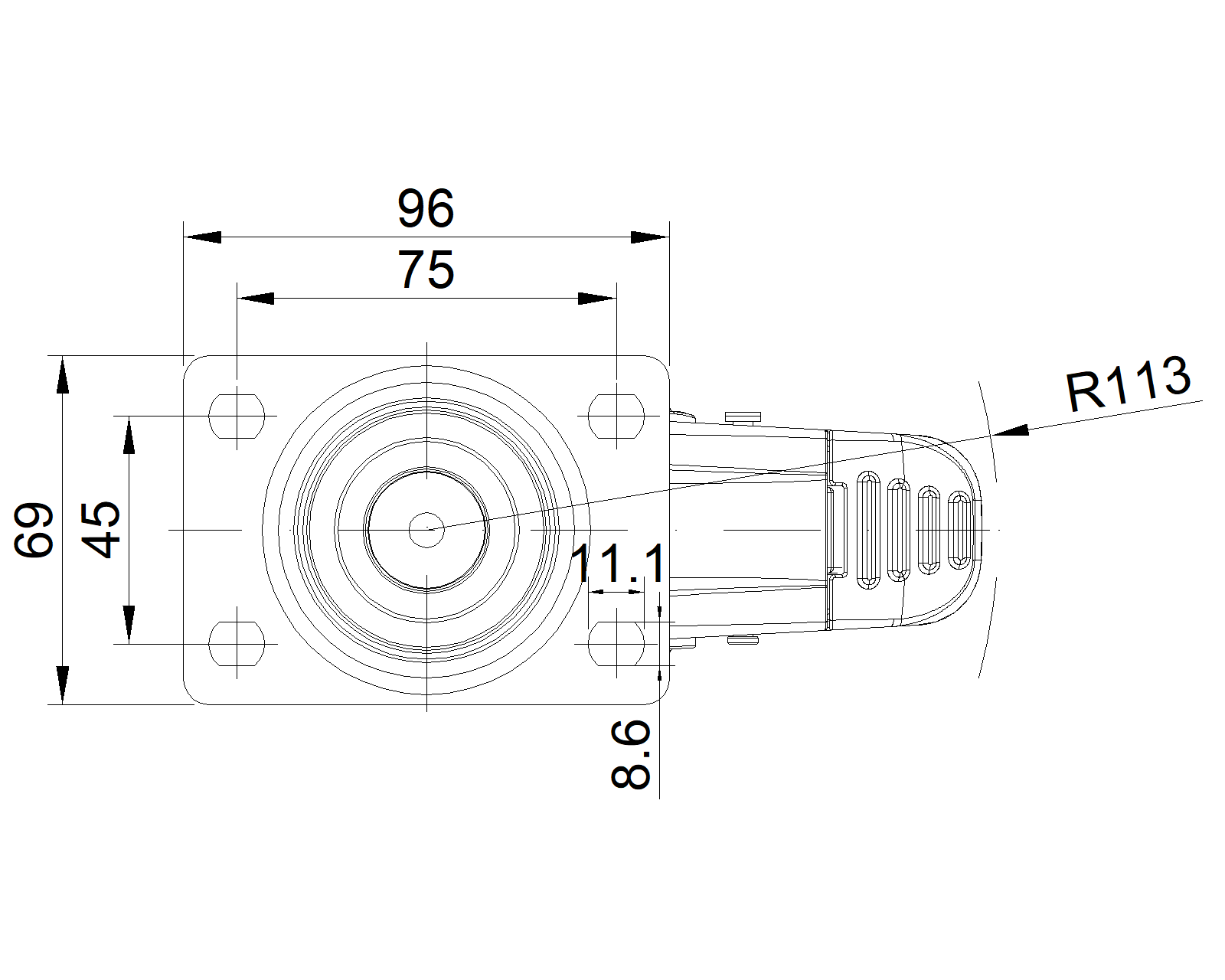 Bánh xe có hệ thống khóa phanh kép, đế cao cấp—75x45, đế lỗ góc Chân màu xanh xám làm bằng polyamide gia cố, lắp đế Chống gỉ, chống ăn mòn, thẩm mỹ, tiết kiệm và xoay linh hoạt Lõi bánh xe bằng polypropylene chống va đập, bề mặt bánh xe bằng nhựa nhiệt dẻo đàn hồi (TPR) Bánh xe màu xám đậm—loại ống giữa |