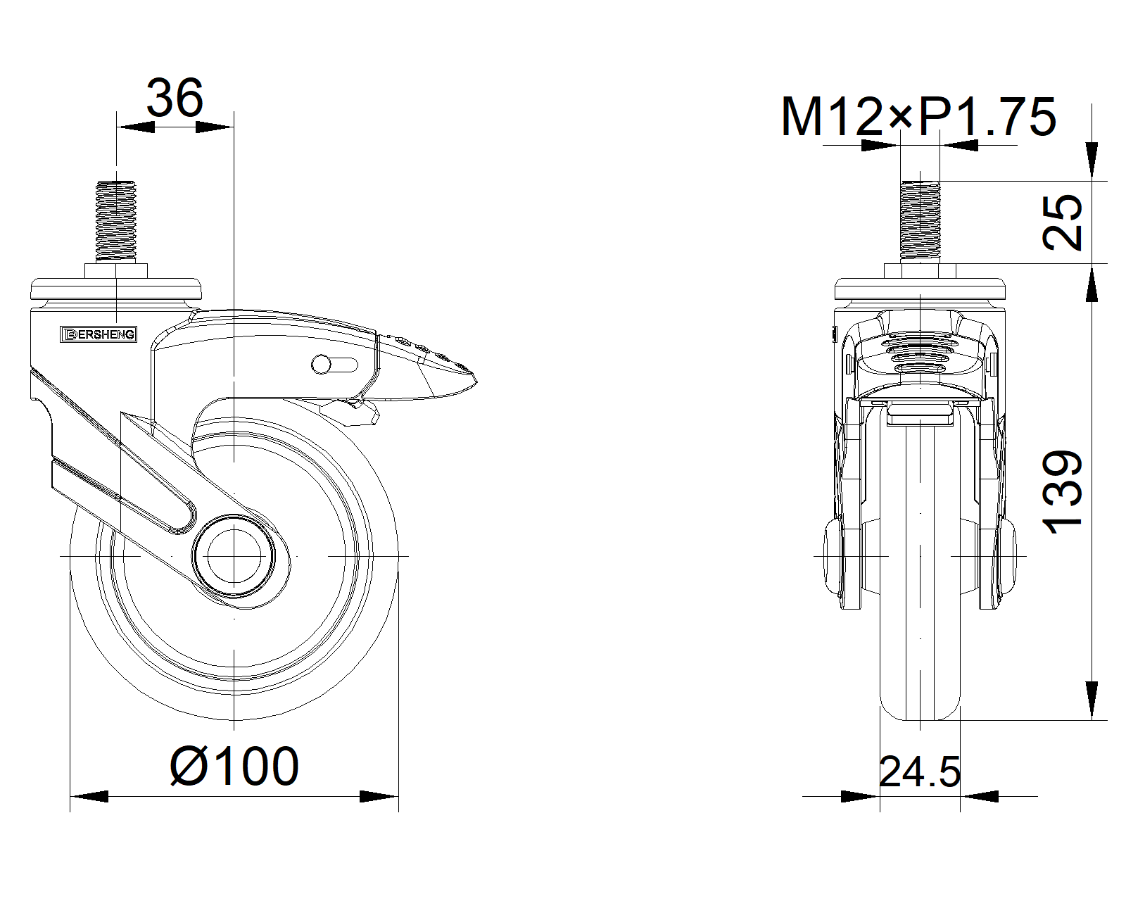 Khóa lõi bằng chân polyamide—nắp tròn M12x25 Mạ điện bề mặt ren, thiết bị lắp ren Lõi bánh xe bằng polypropylen chống va đập, bề mặt bánh xe bằng nhựa nhiệt dẻo đàn hồi (TPR) Vòng bi bánh xe màu xám đậm—vòng bi chính xác. |