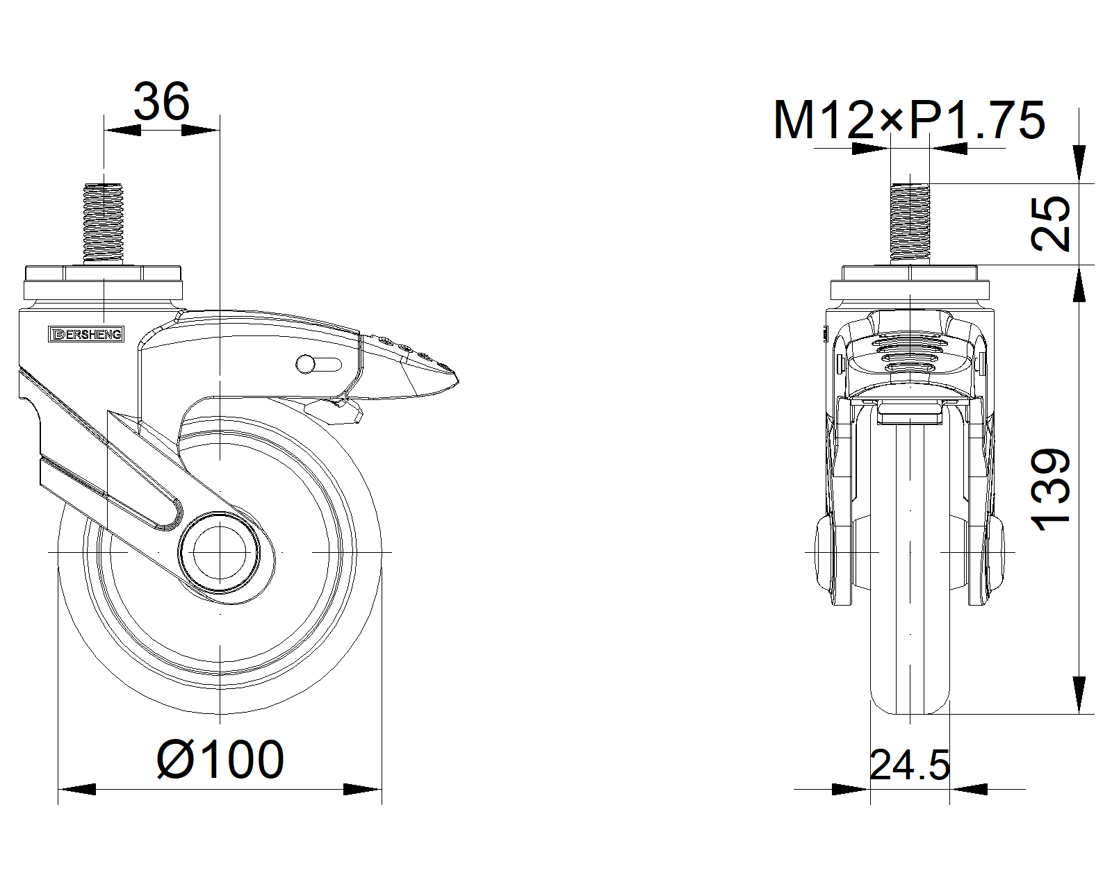 Hệ thống bánh xe khóa kép, ren M12x25 Chân màu xanh xám làm bằng polyamide gia cố, lắp ren Chống gỉ, chống ăn mòn, thẩm mỹ, tiết kiệm và xoay linh hoạt Lõi bánh xe bằng polypropylene chống va đập, bề mặt bánh xe bằng nhựa nhiệt dẻo đàn hồi (TPR) Bánh xe dạng ống trung tâm màu xám đậm |