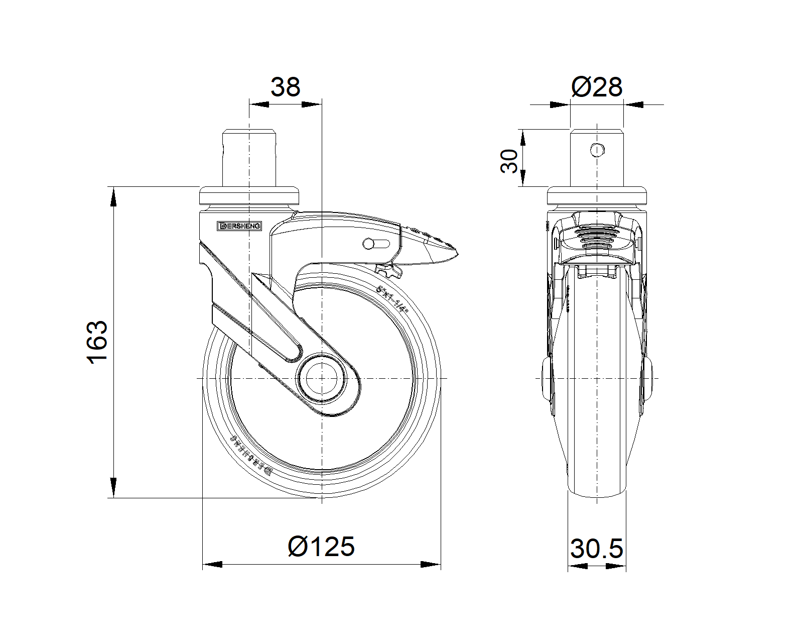 Bánh xe có hệ thống phanh định hướng dài, khóa bánh xe, đinh tán chốt—Ø28x30L Chân màu xám đậm làm bằng polyamide gia cố, lắp đặt bằng chốt Chống gỉ, chống ăn mòn, thẩm mỹ, tiết kiệm và xoay linh hoạt Lõi bánh xe bằng polypropylen chống va đập, bề mặt bánh xe bằng nhựa nhiệt dẻo đàn hồi (TPR) Bánh xe màu xám đậm—loại ống trung tâm |
