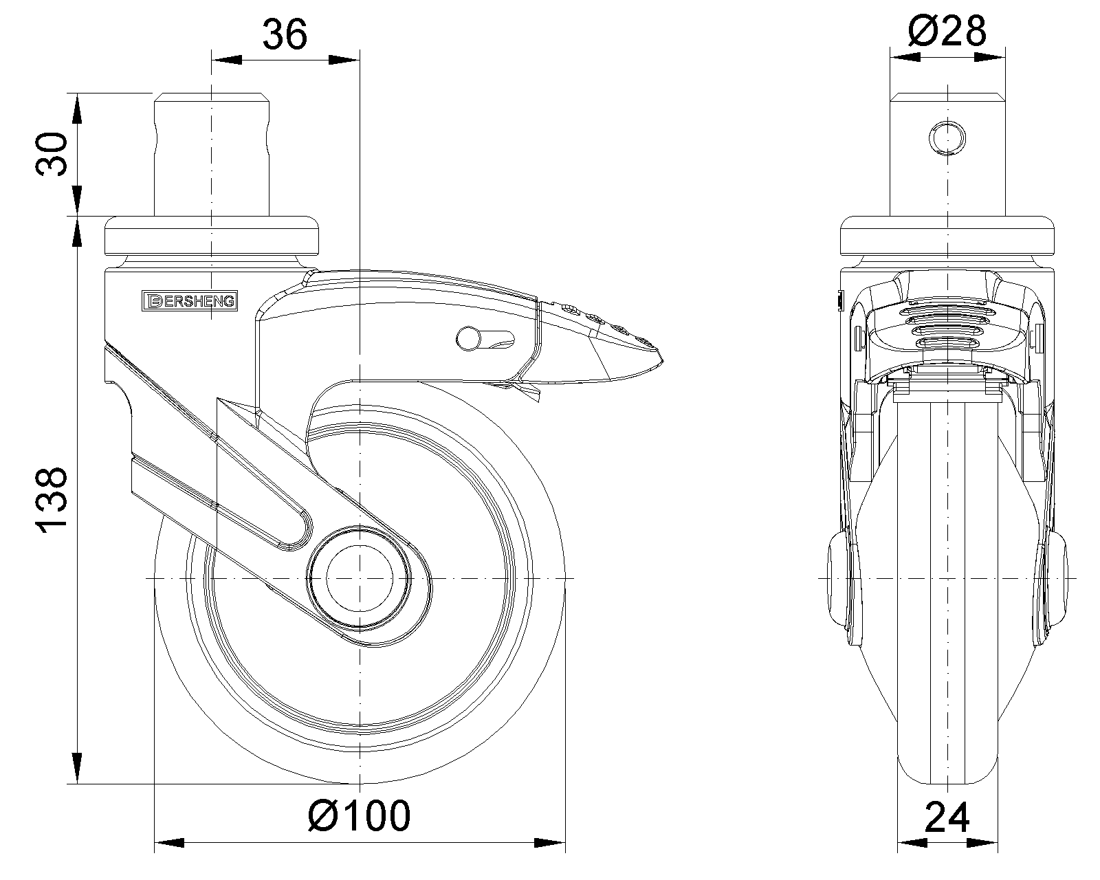 Bánh xe với hệ thống khóa phanh định hướng dài, đinh tán chốt—Ø28x30L Bánh xe Pearl với lớp gia cường polyamide, lắp đặt chốt Chống gỉ, chống ăn mòn, thẩm mỹ, tiết kiệm và xoay linh hoạt Lõi bánh xe bằng polypropylene chống va đập, bề mặt bánh xe bằng nhựa nhiệt dẻo đàn hồi (TPR) Vòng bi bánh xe màu xám đậm—vòng bi chính xác |