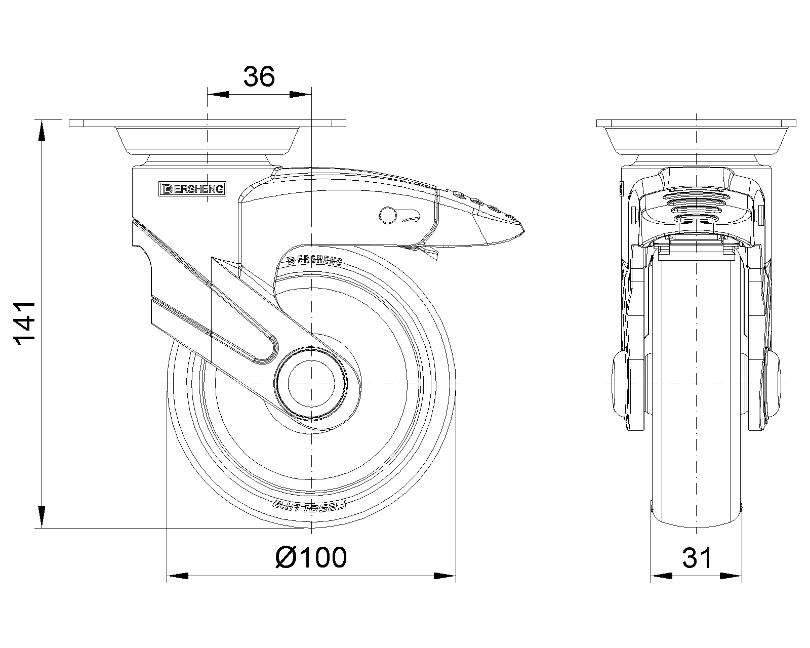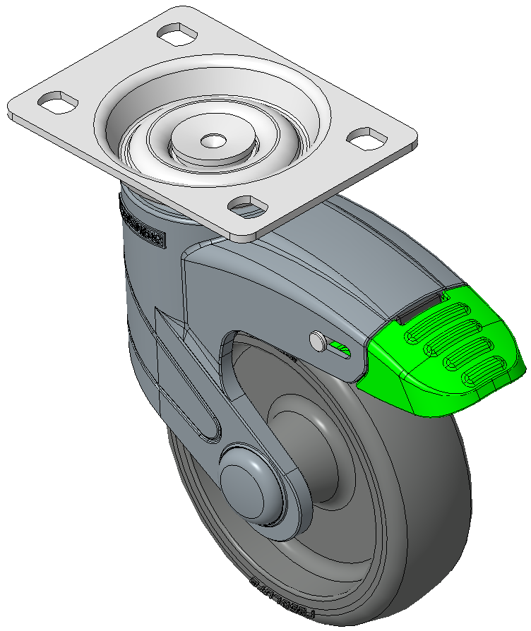 Bánh xe với hệ thống khóa phanh định hướng dài, đế cao cấp—đế lỗ góc 75x45 Chân bánh xe bằng nhựa polyamide gia cường, lắp đế Chống gỉ, chống ăn mòn, thẩm mỹ, tiết kiệm và xoay linh hoạt Lõi bánh xe bằng polypropylen chống va đập, bề mặt bánh xe bằng nhựa nhiệt dẻo đàn hồi (TPR) Bánh xe màu xám đậm—loại ống giữa |