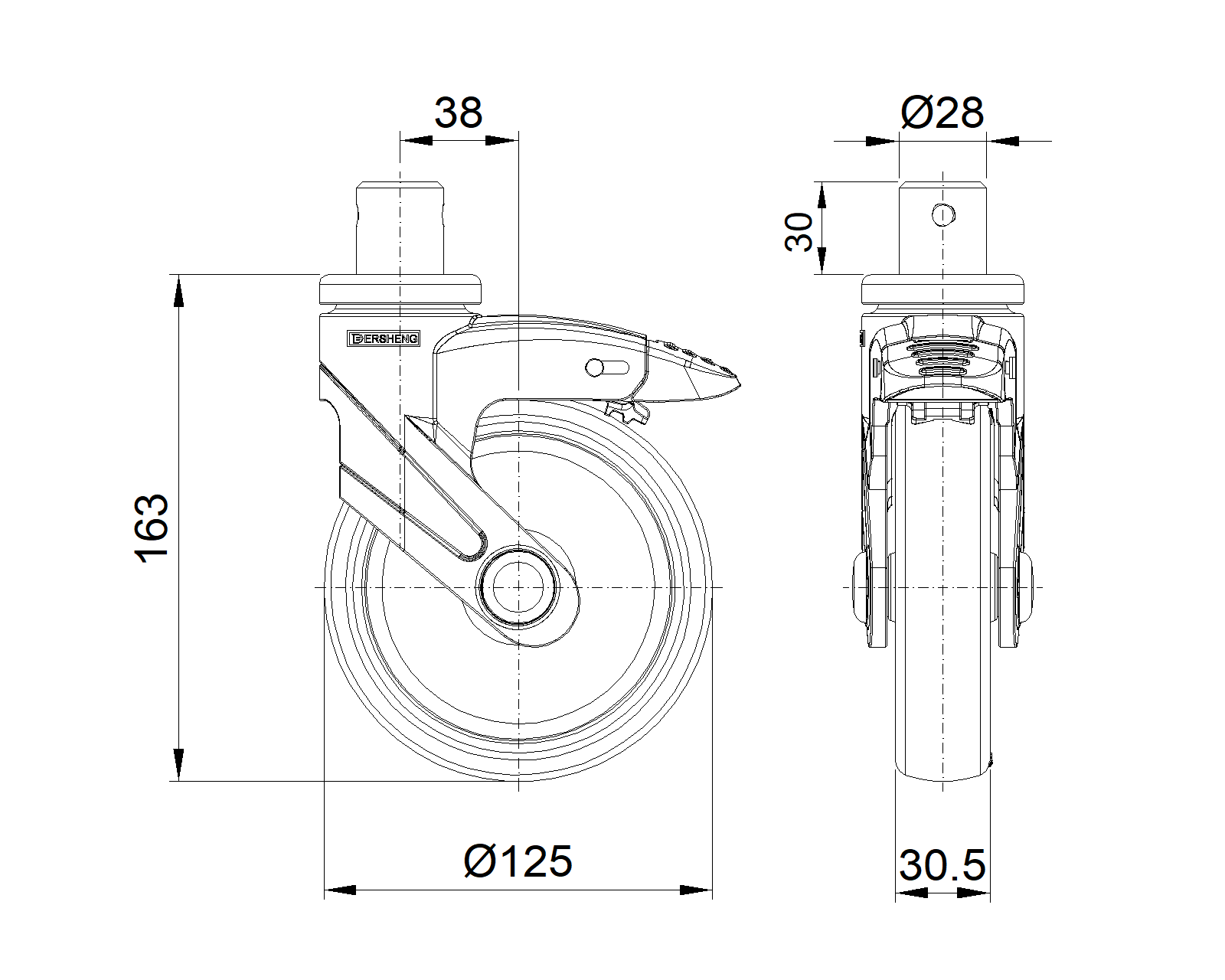 Bánh xe có hệ thống phanh định hướng dài, khóa bánh xe, đinh tán chốt—Ø28x30L Chân màu xanh xám làm bằng vật liệu polyamide gia cố, lắp đặt bằng chốt Chống gỉ, chống ăn mòn, thẩm mỹ, tiết kiệm và xoay linh hoạt Lõi bánh xe bằng polypropylen chống va đập, bề mặt bánh xe bằng nhựa nhiệt dẻo đàn hồi (TPR) Bánh xe màu xám đậm—loại ống trung tâm |