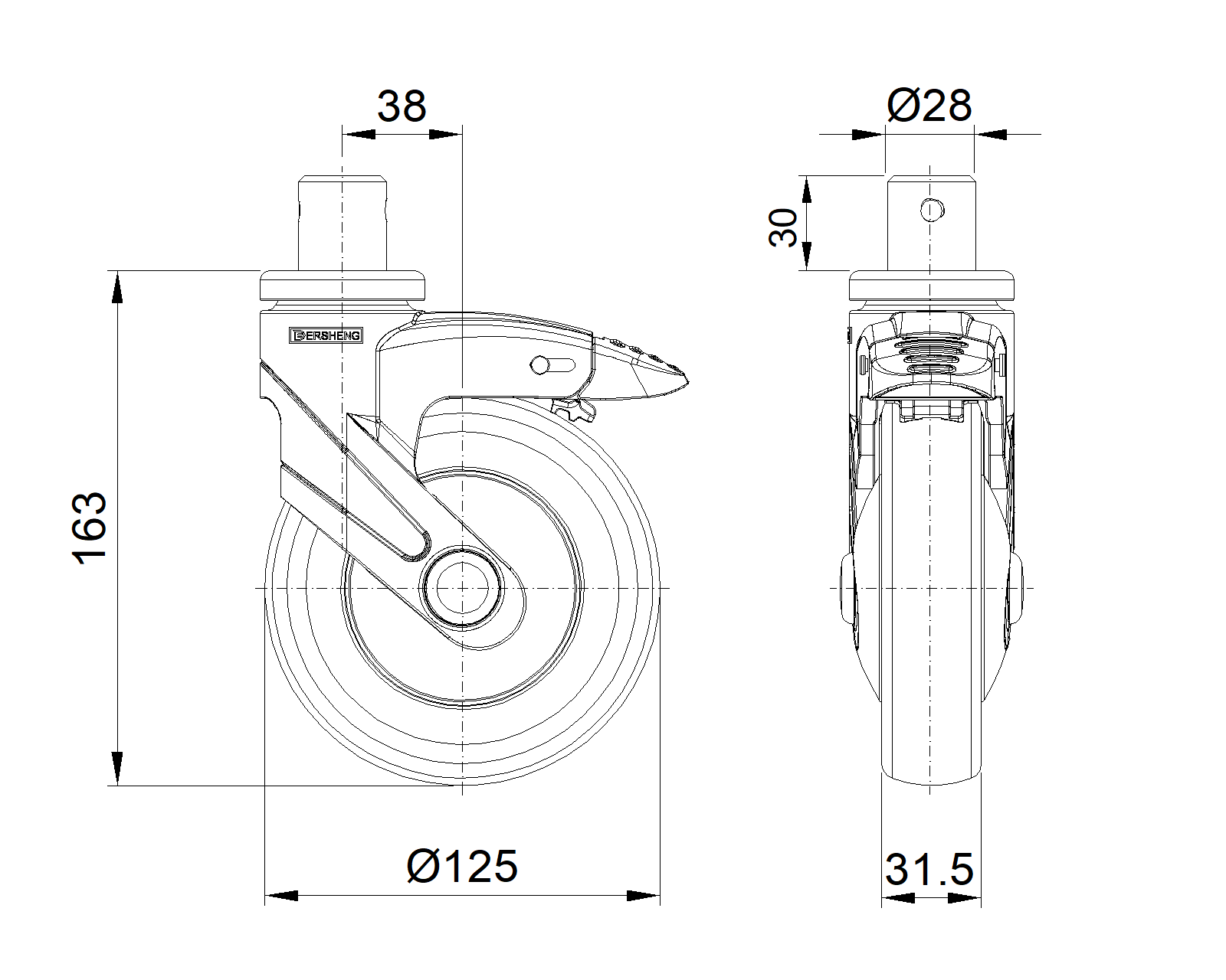 Bánh xe có hệ thống phanh định hướng dài, khóa bánh xe, đinh tán chốt—Ø28x30L Chân màu xanh xám làm bằng vật liệu polyamide gia cố, lắp đặt bằng chốt Chống gỉ, chống ăn mòn, thẩm mỹ, tiết kiệm và xoay linh hoạt Lõi bánh xe bằng polypropylen chống va đập, bề mặt bánh xe bằng nhựa nhiệt dẻo đàn hồi (TPR) Bánh xe màu xám đậm—loại ống trung tâm |