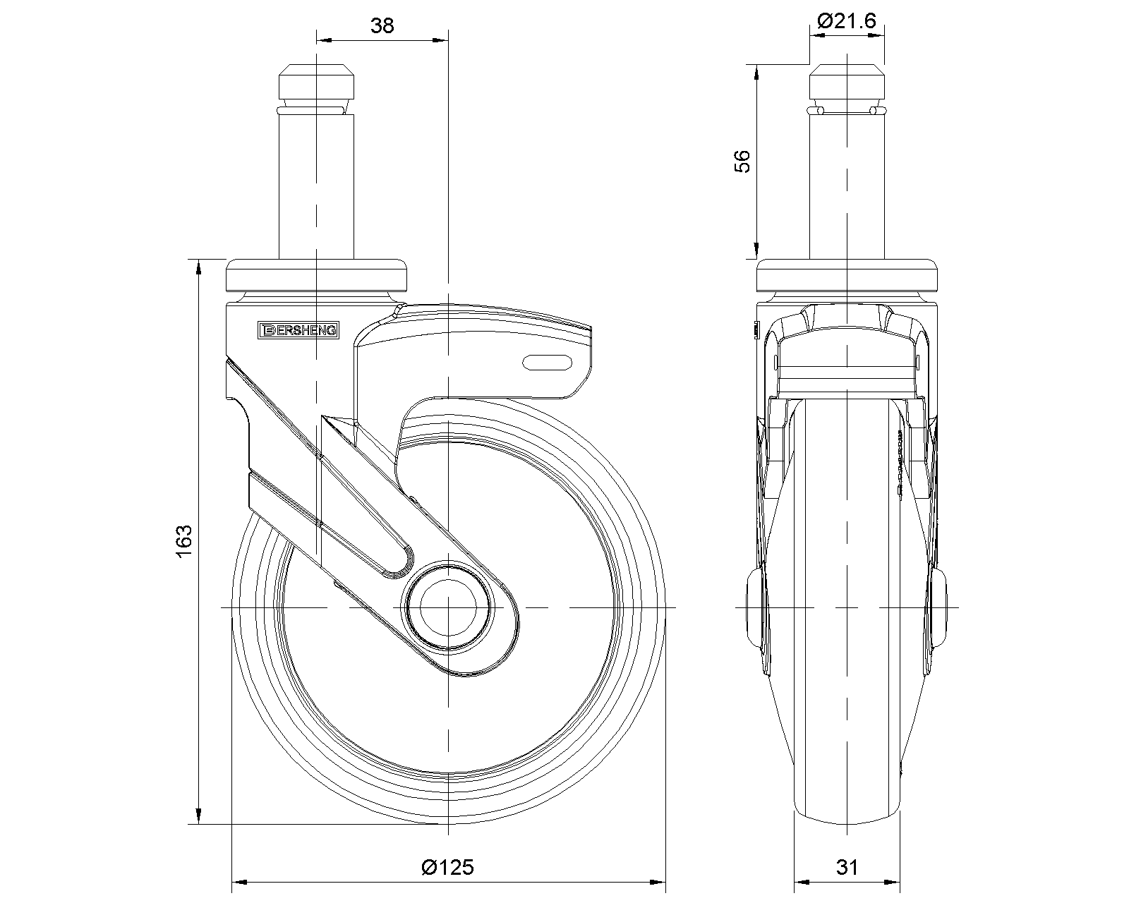 | Bánh xe cố định, đinh tán chốt—Ø21.6x56L với vòng chữ C Bánh xe màu đen gia cố bằng polyamide, lắp đặt bằng chốt Chống gỉ, chống ăn mòn, thẩm mỹ, tiết kiệm và cho phép quay trơn tru Lõi bánh xe bằng polypropylen chống va đập, bề mặt bánh xe bằng nhựa nhiệt dẻo đàn hồi (TPR) Vòng bi bánh xe màu đen—vòng bi chính xác |