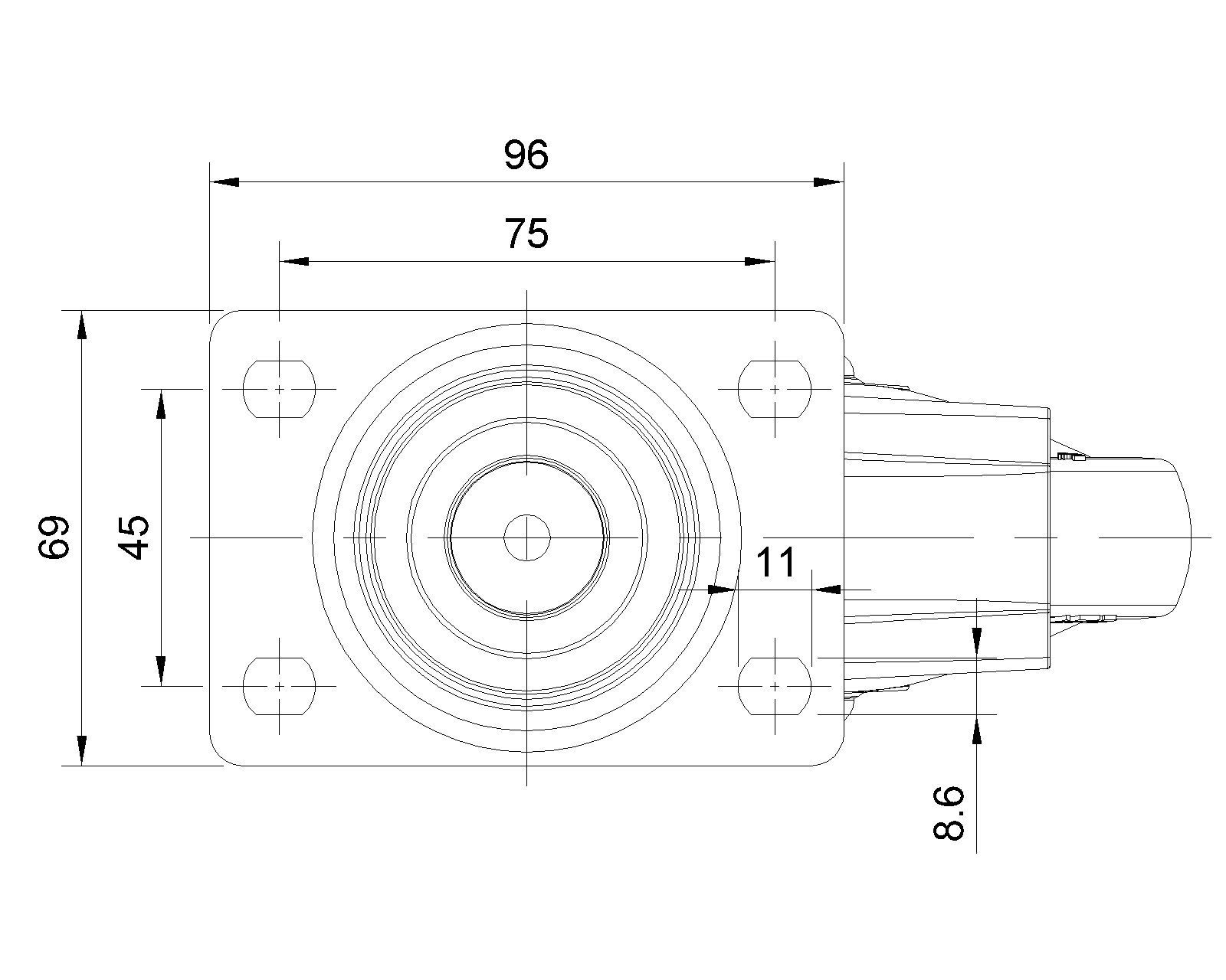 | Bánh xe cố định, đế cao cấp—đế lỗ góc 75x45 Chân màu đen làm bằng vật liệu gia cố polyamide, lắp đế Chống gỉ, chống ăn mòn, thẩm mỹ, tiết kiệm và cho phép xoay linh hoạt Lõi bánh xe bằng polypropylene chống va đập, bề mặt bánh xe bằng nhựa nhiệt dẻo đàn hồi (TPR) Vòng bi bánh xe màu đen—vòng bi chính xác |