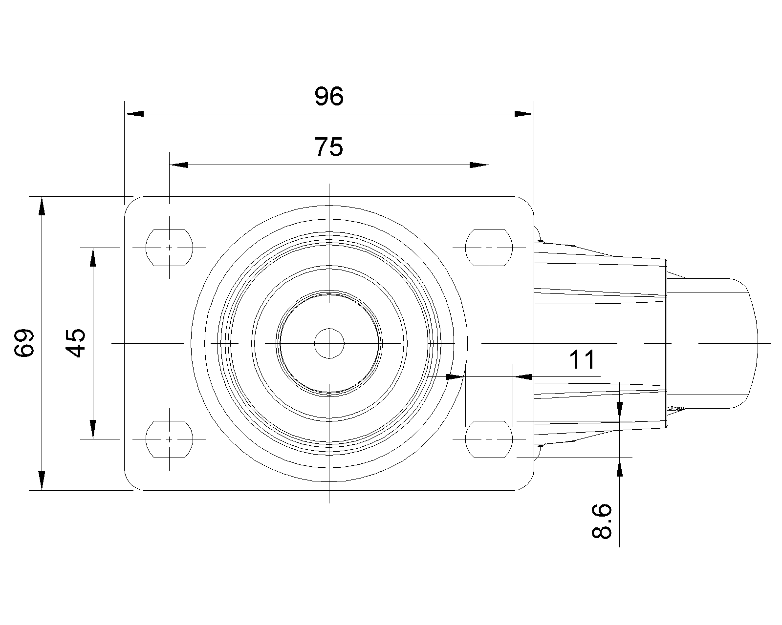 | Bánh xe cố định, đế cao cấp—đế lỗ góc 75x45 Chân màu đen gia cố bằng polyamide, lắp đế Chống gỉ, chống ăn mòn, thẩm mỹ, tiết kiệm và cho phép xoay linh hoạt Lõi bánh xe bằng polypropylene chống va đập, bề mặt bánh xe bằng nhựa nhiệt dẻo đàn hồi (TPR) Bánh xe màu đen—loại ống trung tâm |