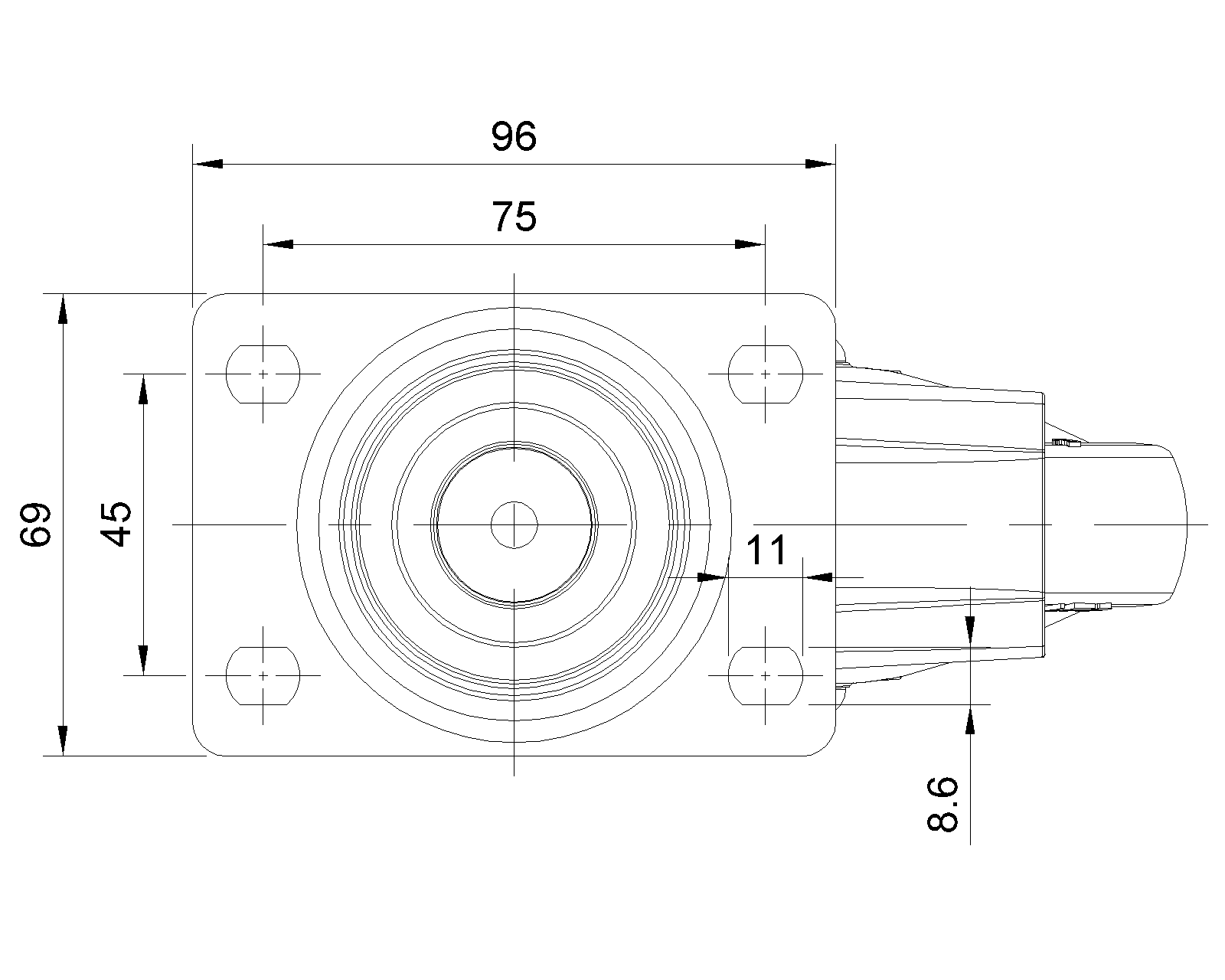 | Bánh xe cố định, đế cao cấp—đế lỗ góc 75x45 Chân màu đen gia cố bằng polyamide, lắp đế Chống gỉ, chống ăn mòn, thẩm mỹ, tiết kiệm và cho phép xoay linh hoạt Lõi bánh xe bằng polypropylene chống va đập, bề mặt bánh xe bằng nhựa nhiệt dẻo đàn hồi (TPR) Bánh xe màu đen—loại ống trung tâm |