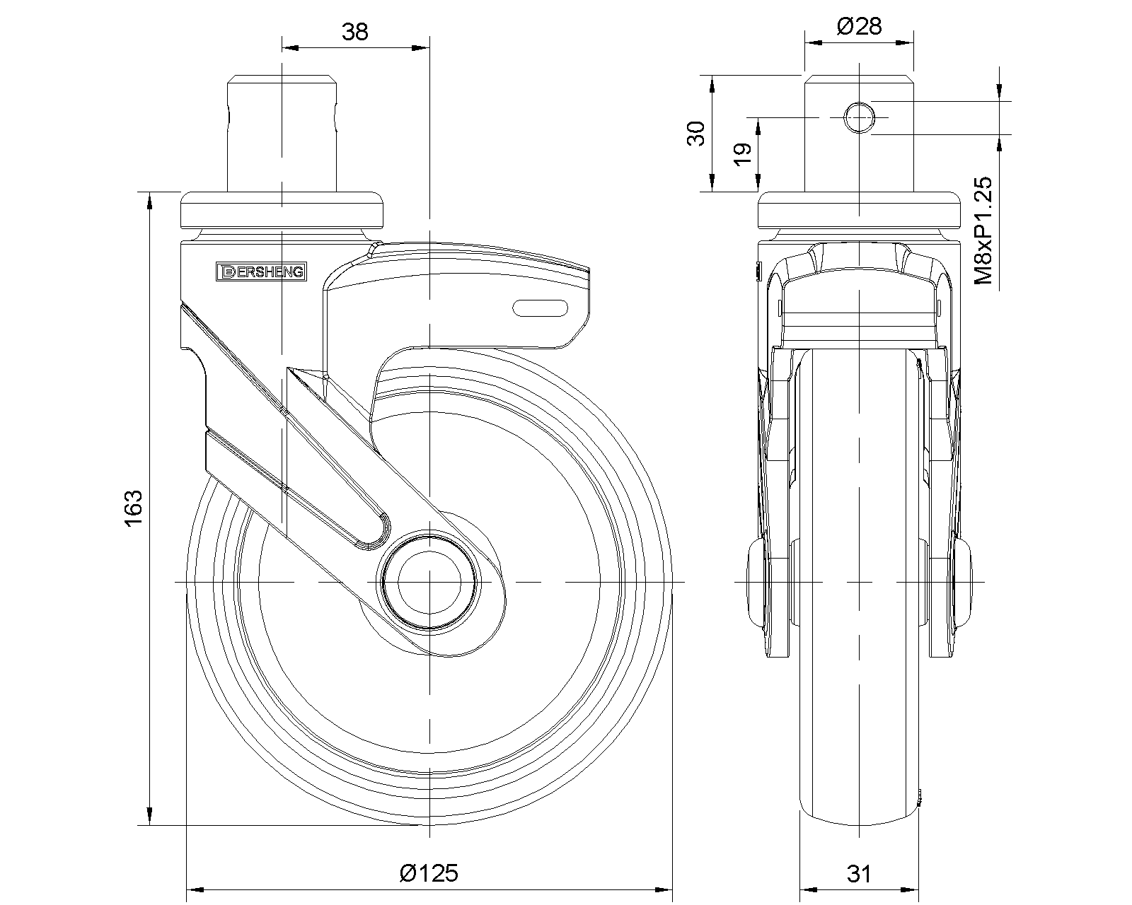 | Bánh xe cố định, đinh tán chốt—Ø28x30L Chân màu đen làm bằng vật liệu polyamide gia cường, lắp đặt bằng chốt Chống gỉ, chống ăn mòn, thẩm mỹ, tiết kiệm và cho phép xoay trơn tru Lõi bánh xe bằng polypropylen chống va đập, bề mặt bánh xe bằng nhựa nhiệt dẻo đàn hồi (TPR) Bánh xe màu đen—loại ống trung tâm |