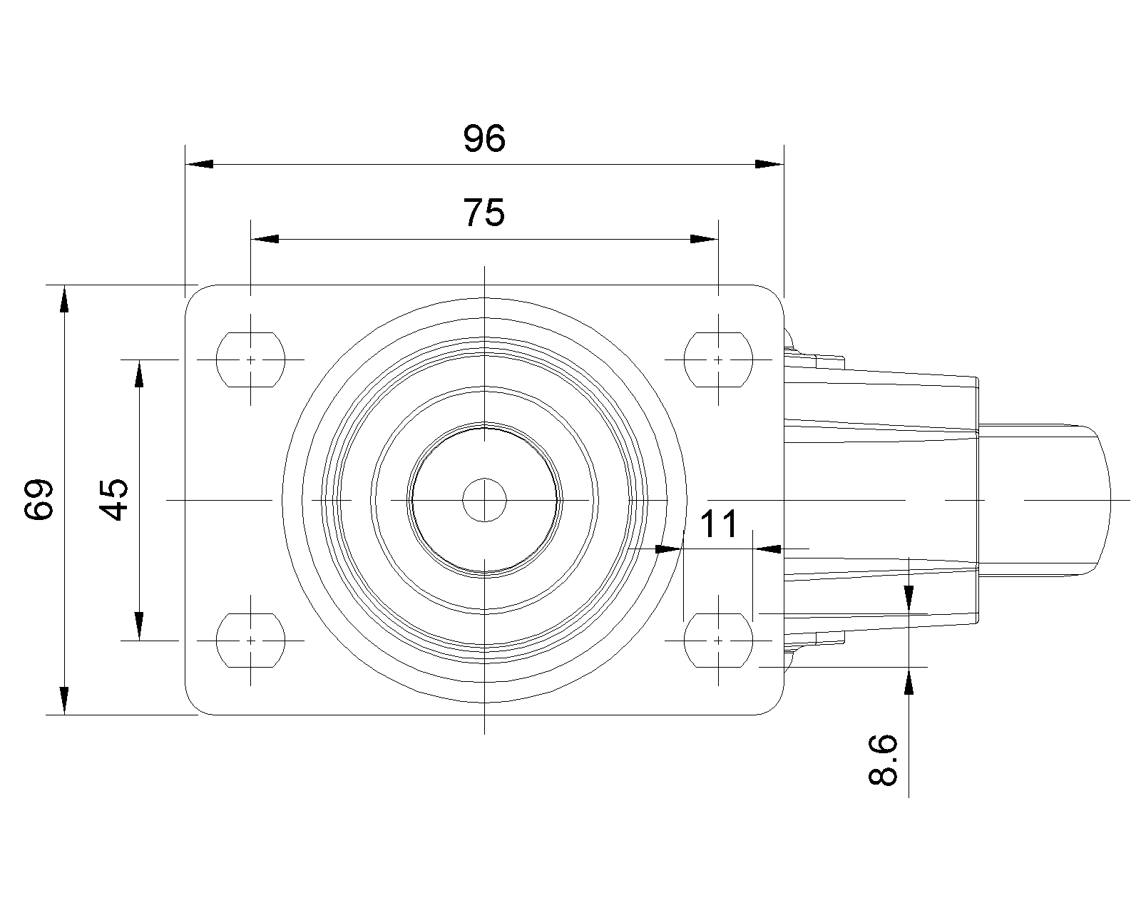 | Bánh xe cố định, đế cao cấp—đế lỗ góc 75x45 Chân màu đen gia cố bằng polyamide, lắp đế Chống gỉ, chống ăn mòn, thẩm mỹ, tiết kiệm và cho phép xoay linh hoạt Lõi bánh xe bằng polypropylene chống va đập, bề mặt bánh xe bằng nhựa nhiệt dẻo đàn hồi (TPR) Bánh xe màu đen—loại ống trung tâm |