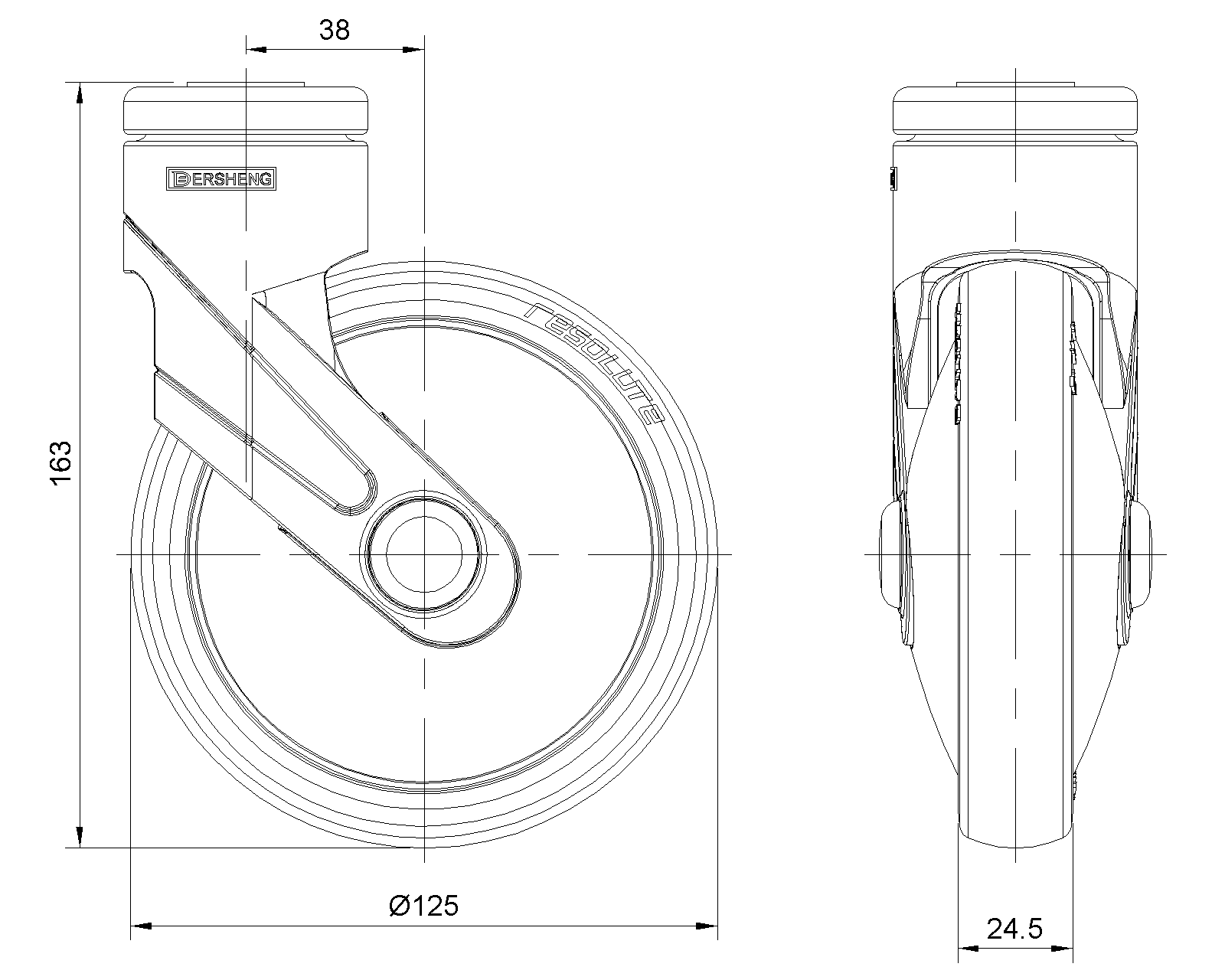 | Cổ điển PPR Bánh xe (đen) Đường kính bánh xe × Chiều rộng bánh xe 125 x 24.5mm |