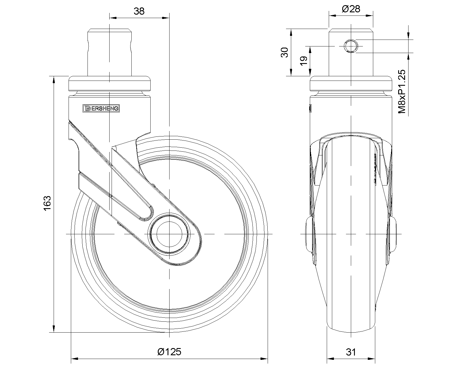 Bánh xe di động, loại đinh tán—Ø28x30L Chân màu đen gia cố bằng polyamide, lắp kiểu xoay Chống gỉ, chống ăn mòn, thẩm mỹ, tiết kiệm và xoay linh hoạt Lõi bánh xe bằng polypropylen chống va đập, bề mặt bánh xe bằng nhựa nhiệt dẻo đàn hồi (TPR) Bánh xe màu đen—loại ống trung tâm |