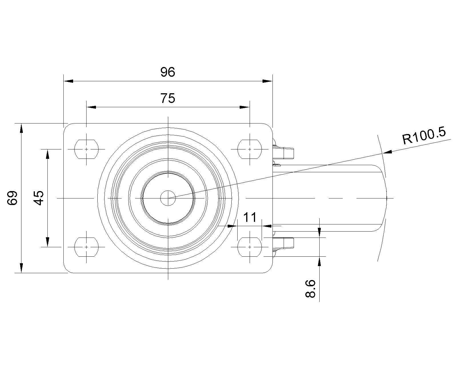 Bánh xe thật, đế cao cấp—đế góc đục lỗ 75x45 Chân đen gia cố bằng polyamide, lắp đế Chống gỉ, chống ăn mòn, thẩm mỹ, tiết kiệm và cho phép xoay trơn tru Lõi bánh xe bằng polypropylene chống va đập, bề mặt bánh xe bằng nhựa nhiệt dẻo đàn hồi (TPR) Bánh xe màu đen—loại ống giữa |