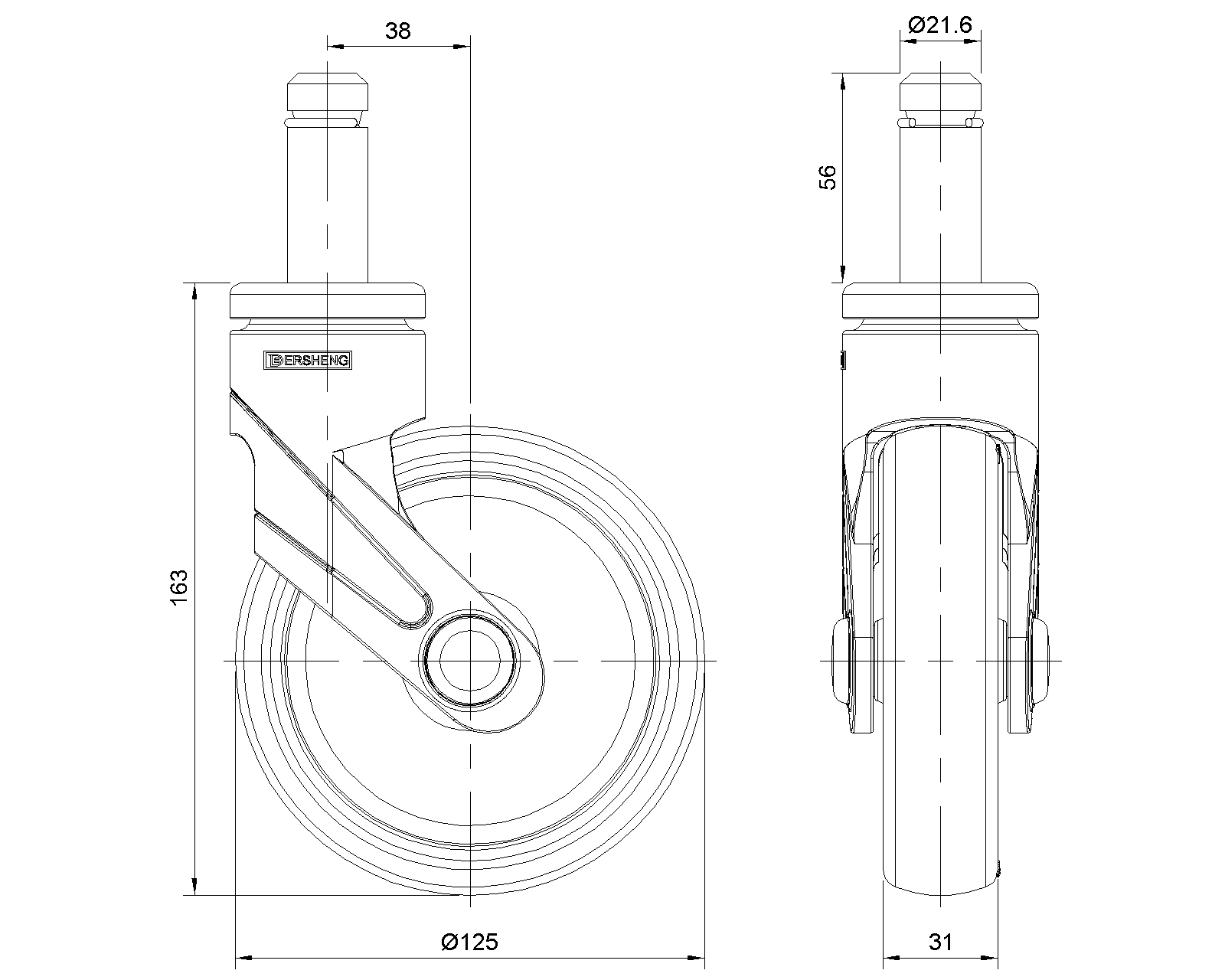 Bánh xe di động, đinh tán chốt—Ø21,6x56L, có vòng chữ C Chân màu đen gia cố bằng polyamide, lắp đặt bằng chốt Chống gỉ, chống ăn mòn, thẩm mỹ, tiết kiệm và xoay trơn tru Lõi bánh xe bằng polypropylen chống va đập, bề mặt bánh xe bằng nhựa nhiệt dẻo đàn hồi (TPR) Bánh xe màu đen—loại ống trung tâm |