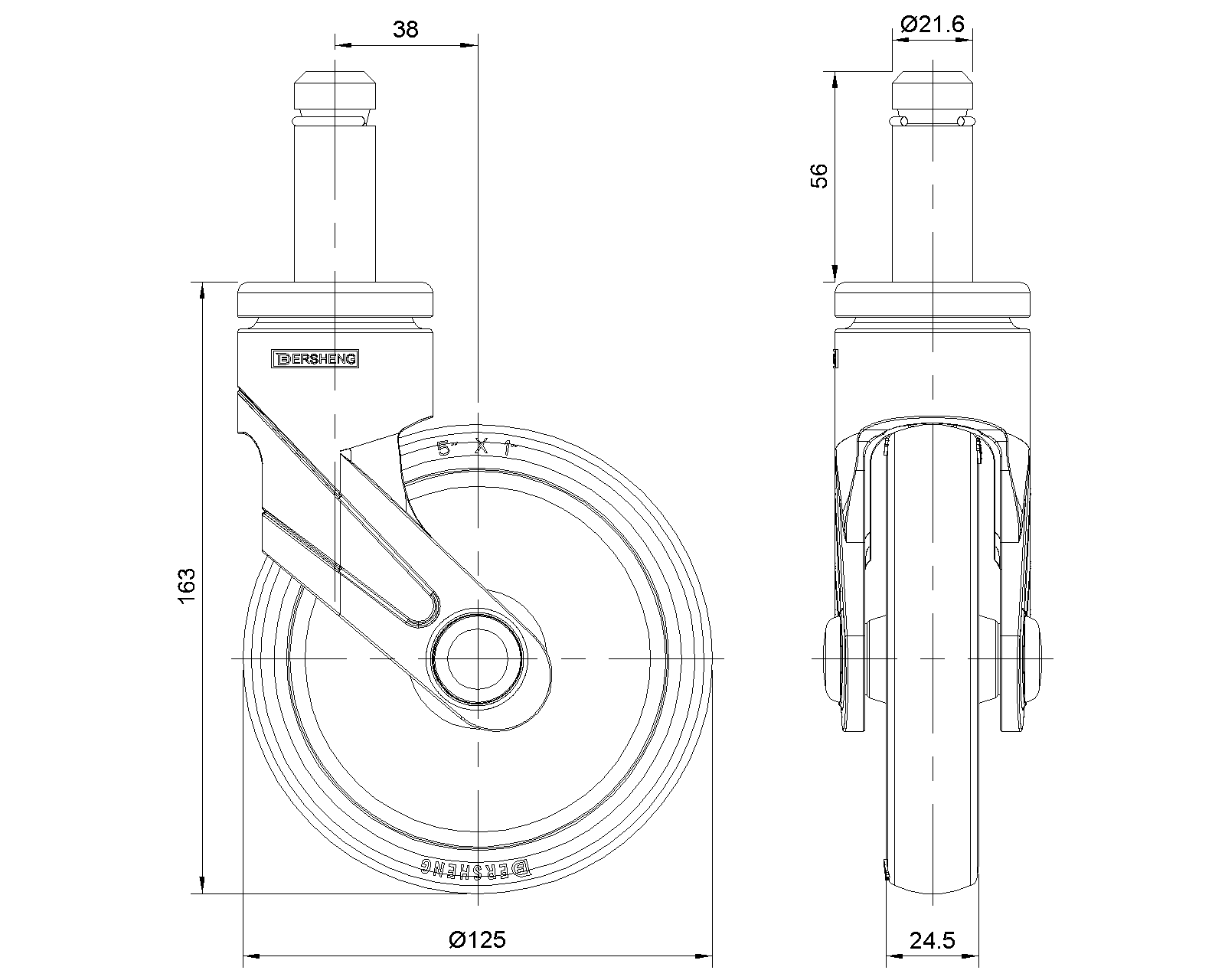 Bánh xe di động, đinh tán chốt—Ø21,6x56L với vòng chữ C Chân màu đen gia cố bằng polyamide, lắp đặt bằng chốt Chống gỉ, chống ăn mòn, thẩm mỹ, tiết kiệm và xoay trơn tru Lõi bánh xe bằng polypropylen chống va đập, bề mặt bánh xe bằng nhựa nhiệt dẻo đàn hồi (TPR) Bánh xe màu đen—loại ống trung tâm |