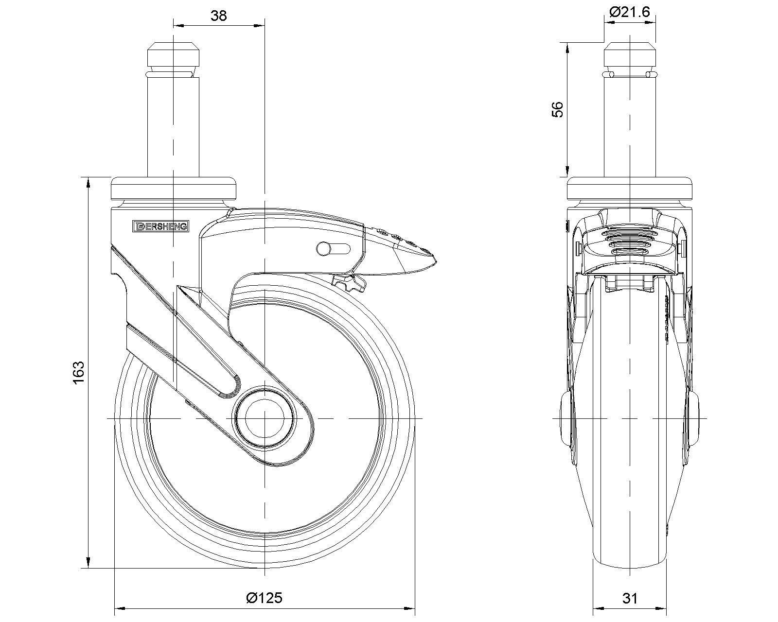 Bánh xe có hệ thống khóa phanh kép, Ø21.6x56L, có vòng đệm chữ C Đế màu đen làm bằng vật liệu gia cố polyamide, lắp đặt bằng phích cắm Chống gỉ, chống ăn mòn, thẩm mỹ, tiết kiệm và quay êm ái Lõi bánh xe bằng polypropylen chống va đập, bề mặt bánh xe bằng nhựa nhiệt dẻo đàn hồi (TPR) Vòng bi bánh xe màu đen—vòng bi chính xác |