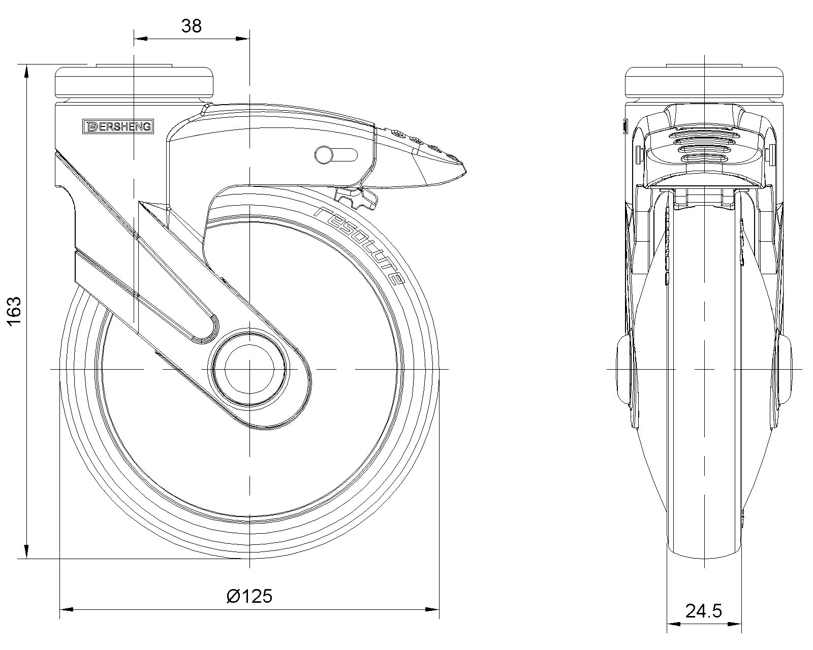 | Cổ điển PPR Bánh xe (đen) Đường kính bánh xe × Chiều rộng bánh xe 125 x 24.5mm |